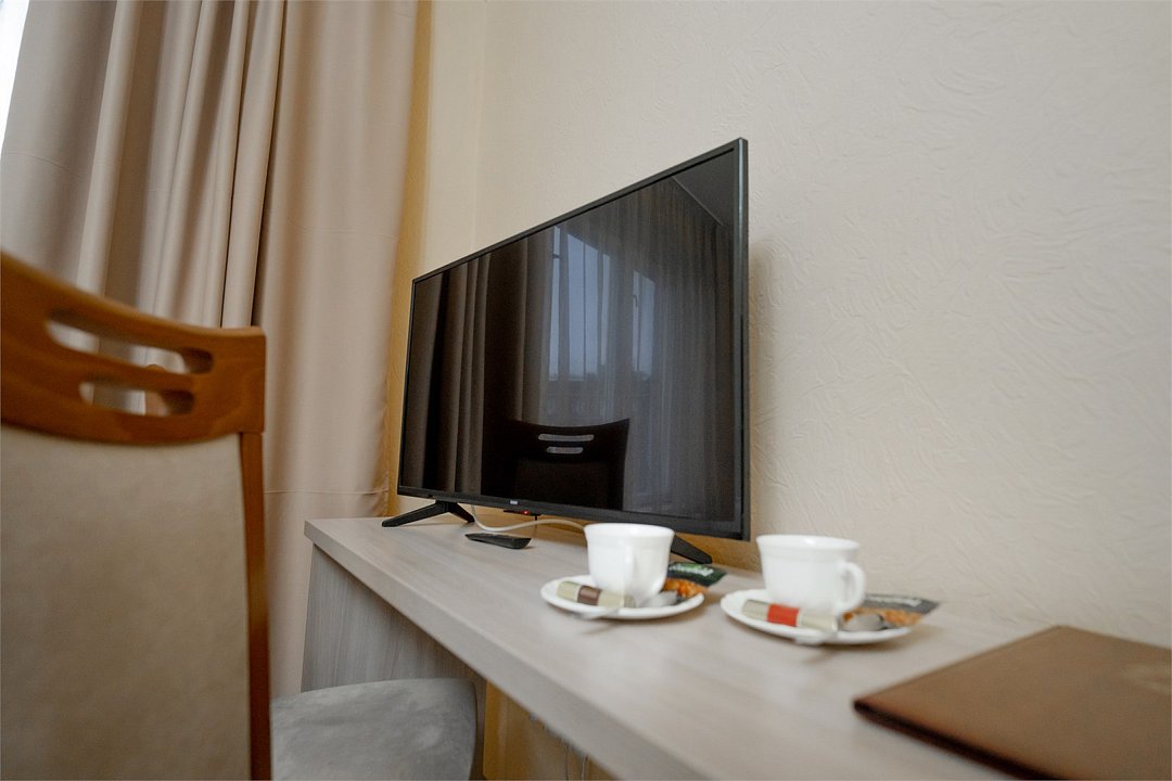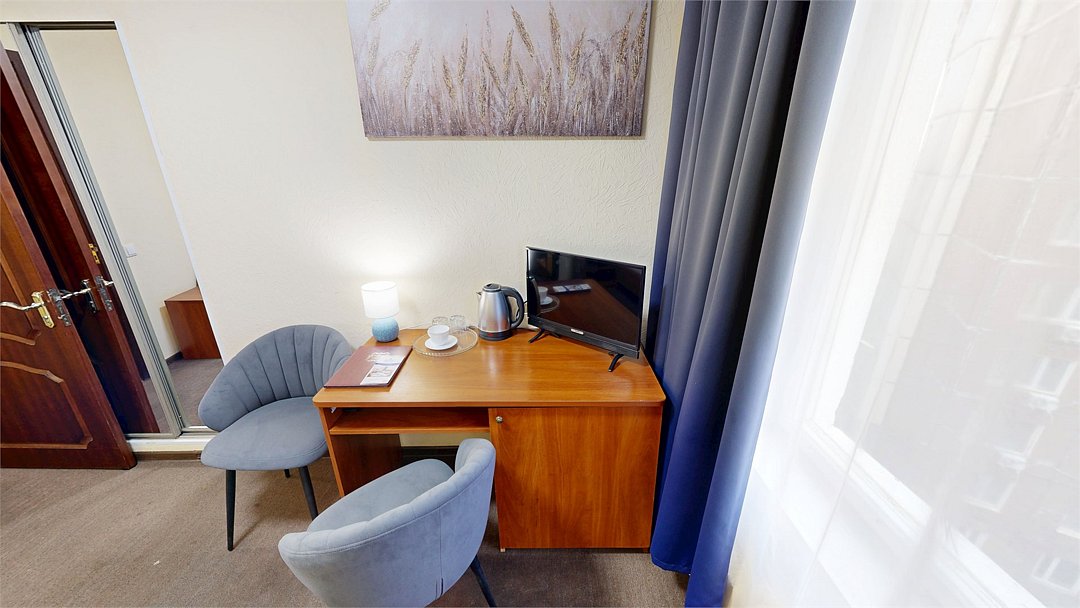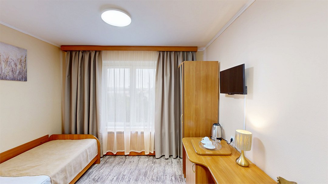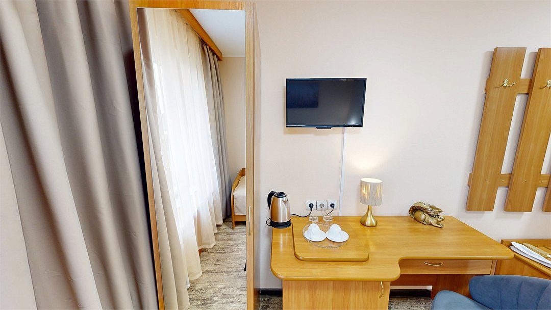 телевизор, Wi-Fi, холодильник, ванна или душевая кабина, банные полотенца, тапочки, гигиенические средства, односпальная кровать, шкаф для одежды, вешалки, письменный стол, багажная тумба, зеркало, чайник, вид на город, вид во двор, стул, туалет, без питомцевВ гостиничном номере