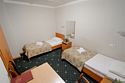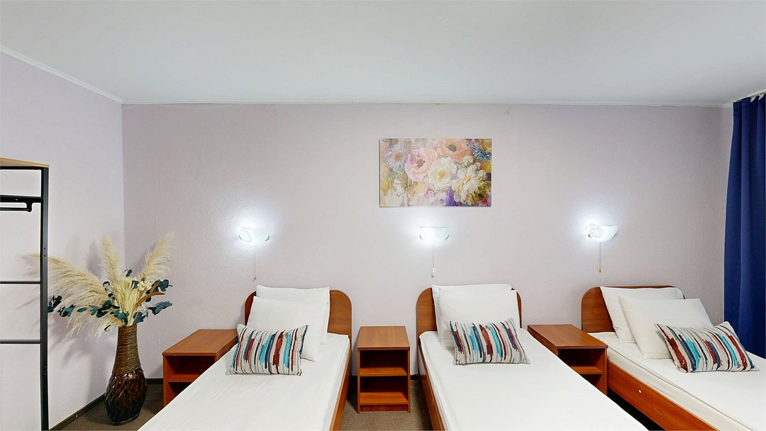 Номер для непритязательных туристов. Укомплектован тремя удобными односпальными кроватями, 3-мя тумбами, шкафом, столом, стулом, зеркалом, телевизором, мини-холодильником, комплектами полотенец, необходимыми туалетными принадлежностями, WiFi. Номер находится в блоке с одноместным номером, санузел/ванна общие на два номера.Услуги и удобства