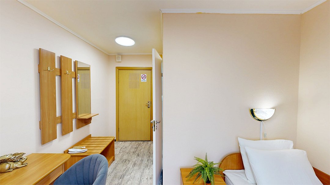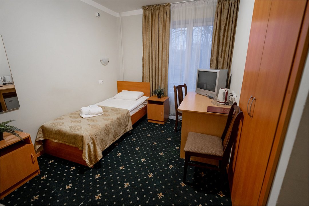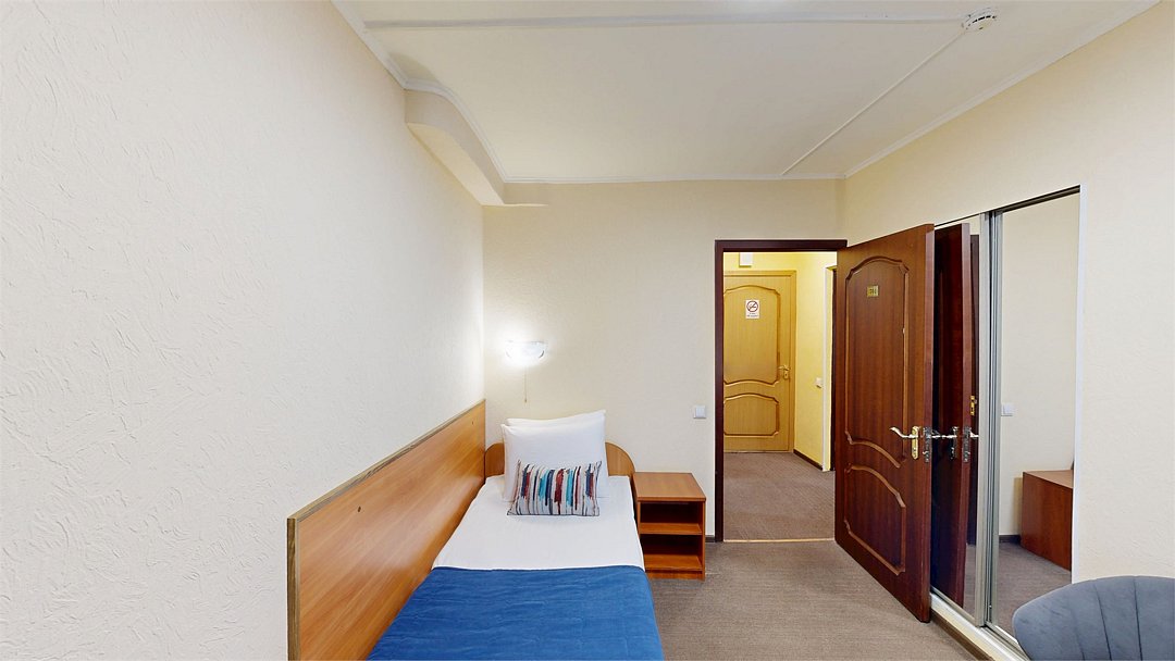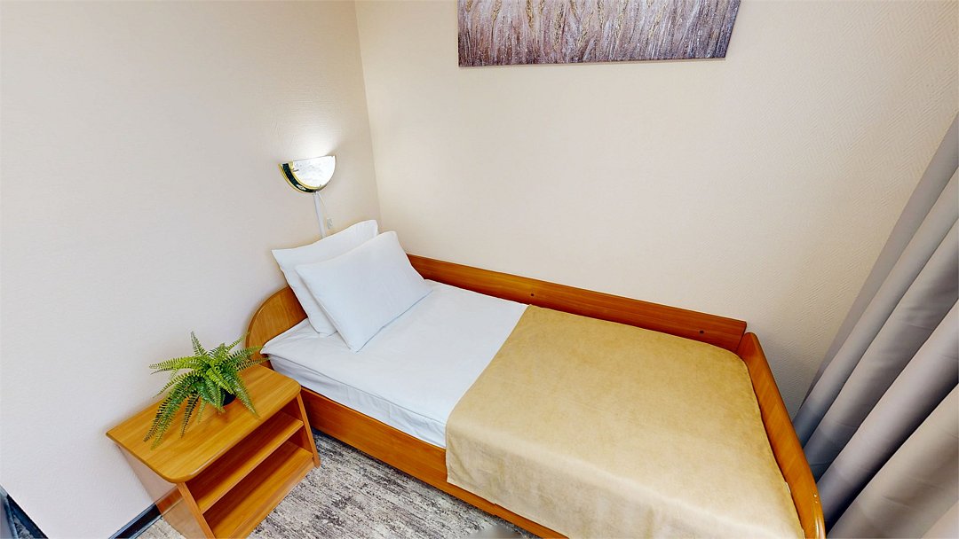 Номер с собственным санузлом/ванной. В номере все необходимое для комфортного отдыха. Укомплектован удобной односпальной кроватью, тумбой, шкафом, столом, стулом, зеркалом, багажницей с вешалкой, телевизором, мини-холодильником, чайником, WiFi.Услуги и удобства