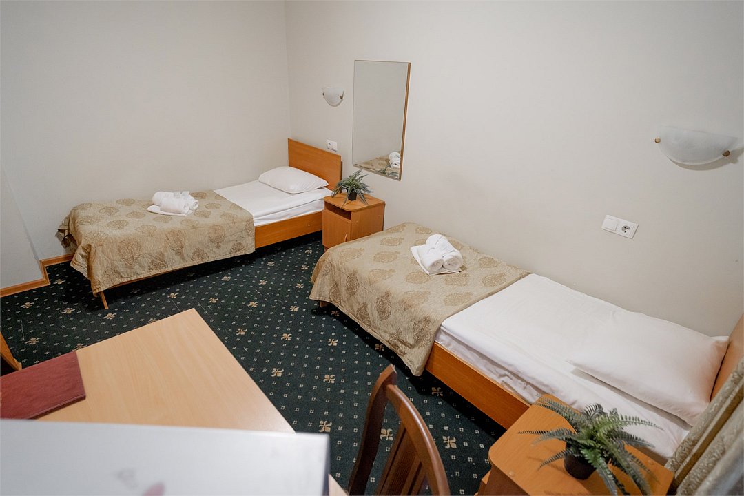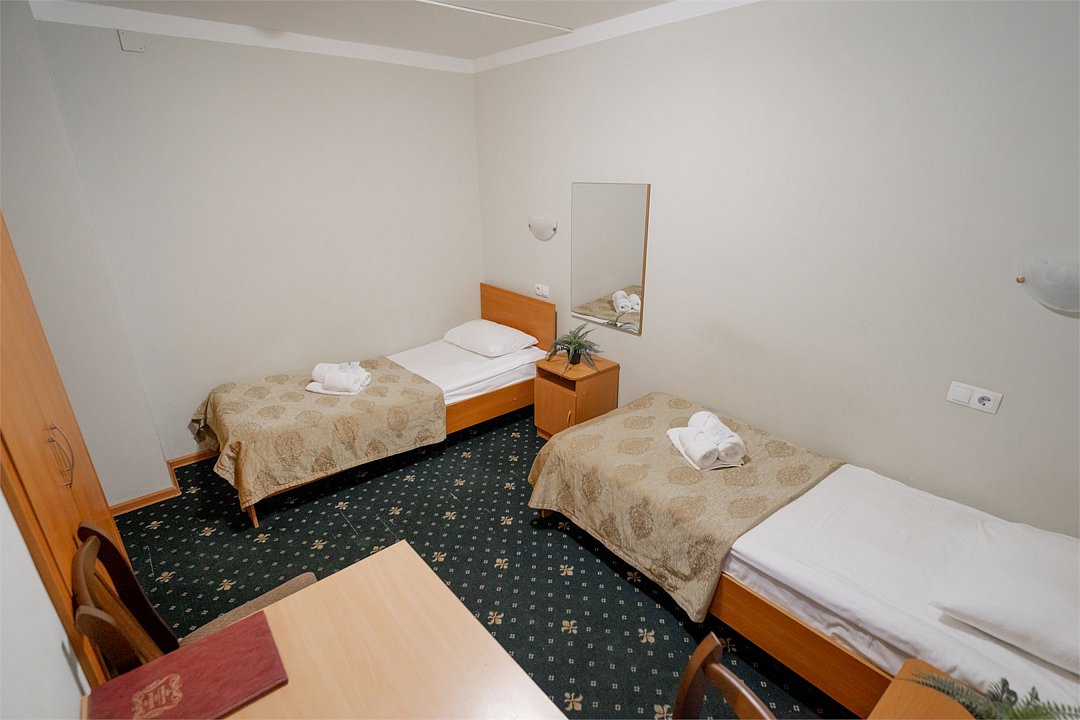 Номер для непритязательного туриста. Укомплектован двумя удобными односпальными кроватями, 2-мя тумбами, шкафом, столом, стулом, зеркалом, телевизором, мини-холодильником, комплектами полотенец, необходимыми туалетными принадлежностями, WiFi. Номер находится в блоке с одноместным номером, санузел/ванна общие на два номера.Услуги и удобства