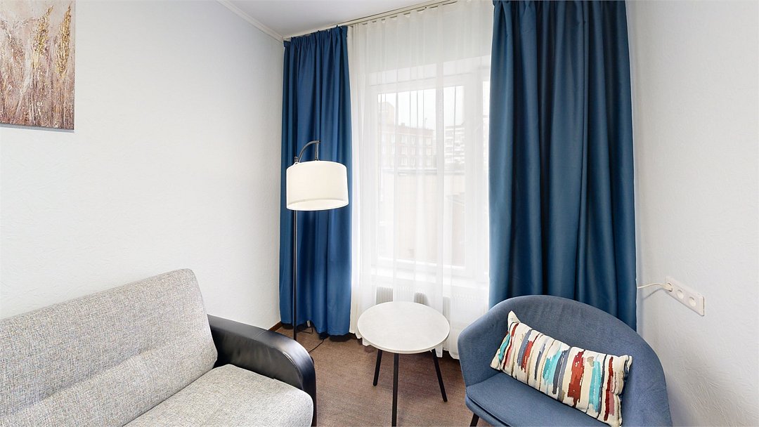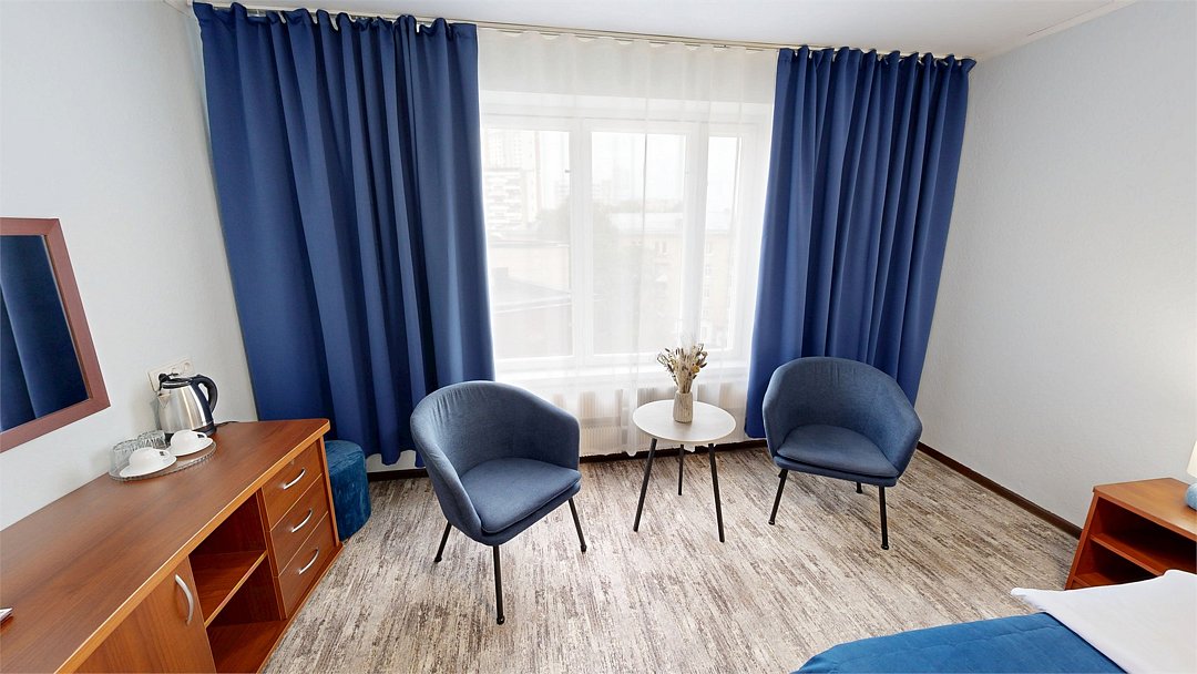 телевизор, Wi-Fi, ванна, санузел, банные полотенца, две односпальные кровати, диван, кресла, тумбы, стулья, шкаф для одежды, вешалки, багажная тумба, зеркало, мебельный гарнитур, чайник, вид на город, вид во двор, стаканы, стол, раскладной диван, мини-холодильник, пуфик, рабочий стол, мыло, без питомцевВ гостиничном номере