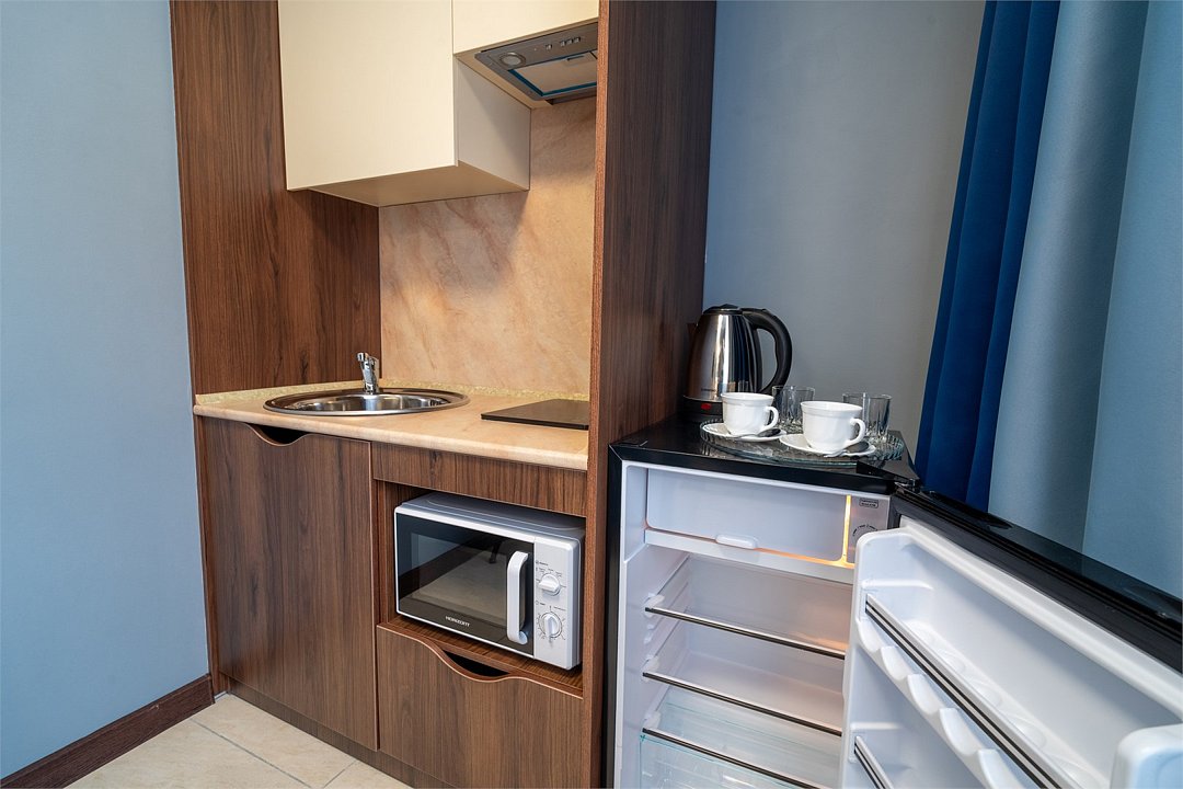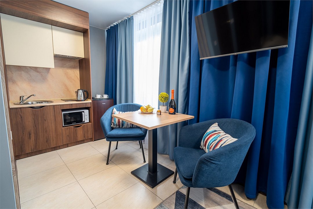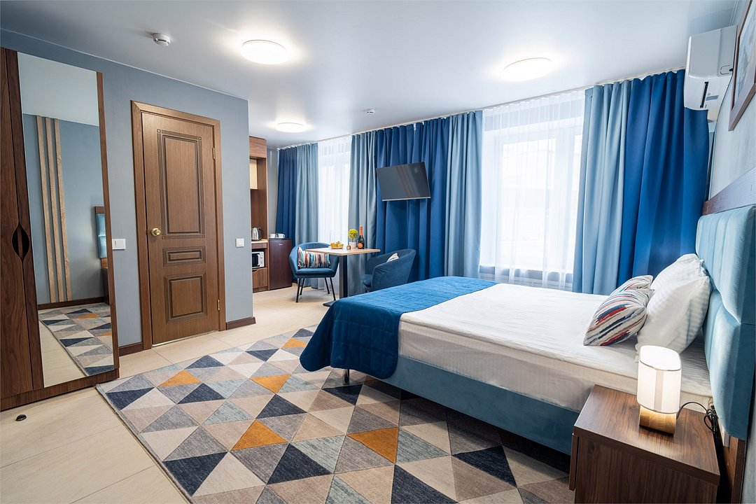 Номера категории "Студия" – это просторные однокомнатные комфортабельные номера, оснащённые современной и стильной корпусной мебелью, а также всеми необходимыми бытовыми техническими средствами. Включающие в себя все характеристики номер категории «Студия», позволяет оформлять нашим гостям как краткосрочное проживание, так и долгосрочное проживание с предоставлением высококачественного сервисного обслуживания. Комплектация каждого номера включает в себя: электронные входные замки с индивидуальным гостевым доступом по пластиковой ключ-карте; качественные эргономичные матрасы, позволяющие достигнуть здорового и глубокого сна; высокоплотные шторы с системой «Блэкаут» (100% затемнение) дают возможность регулировать освещение номера в любое время суток; освещение номера потолочное и прикроватное; продуманная система хранения багажа и личных вещей; напольное твердое гипоаллергенное покрытие; широкоформатные SMART телевизоры; высокоскоростной интернет Wi-Fi сплит-система кондиционирования; мини-кухня с раковиной, чайник, холодильник, обеденная меблированная зона; санузел с душевой кабиной, набором косметических и гигиенических средств, комплект полотенец, халаты, тапочки, фен. Вид из гостиничных номеров направлен во внутренний дворик. Общая площадь номера категории «Студия» 30 кв.м. Максимальное количество размещения в номере 3 человека, с двуспальной или раздельными кроватями и дополнительной раскладной кроватью. Курение в номерах ЗАПРЕЩЕНО!Услуги и удобства
