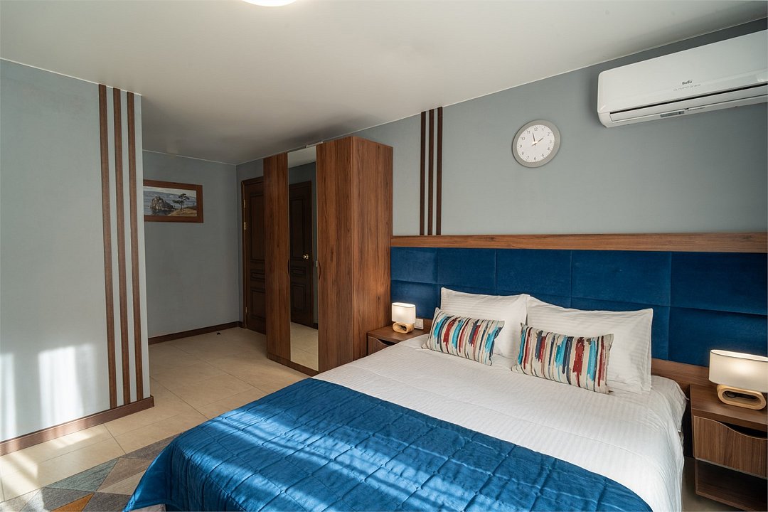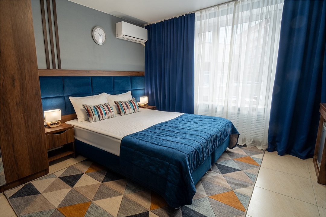 Погрузитесь в уют и современные удобства номеров. Это идеальное место для отдыха как на краткосрочный, так и на продолжительный период. Просторные номера от 18 до 30 м², стильная корпусная мебель и вся необходимая бытовая техника — все это создает атмосферу домашнего уюта и комфорта, с захватывающим видом на город.