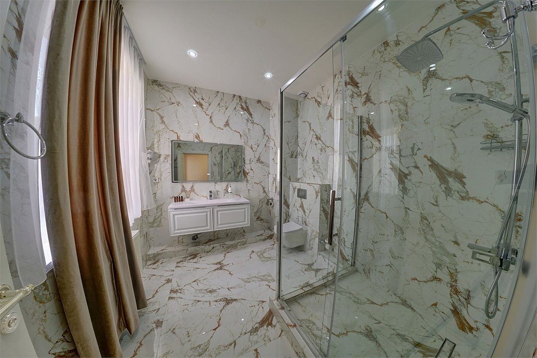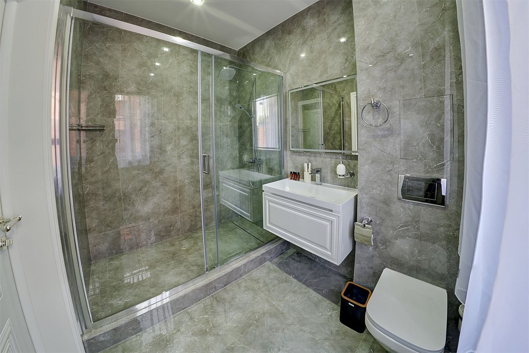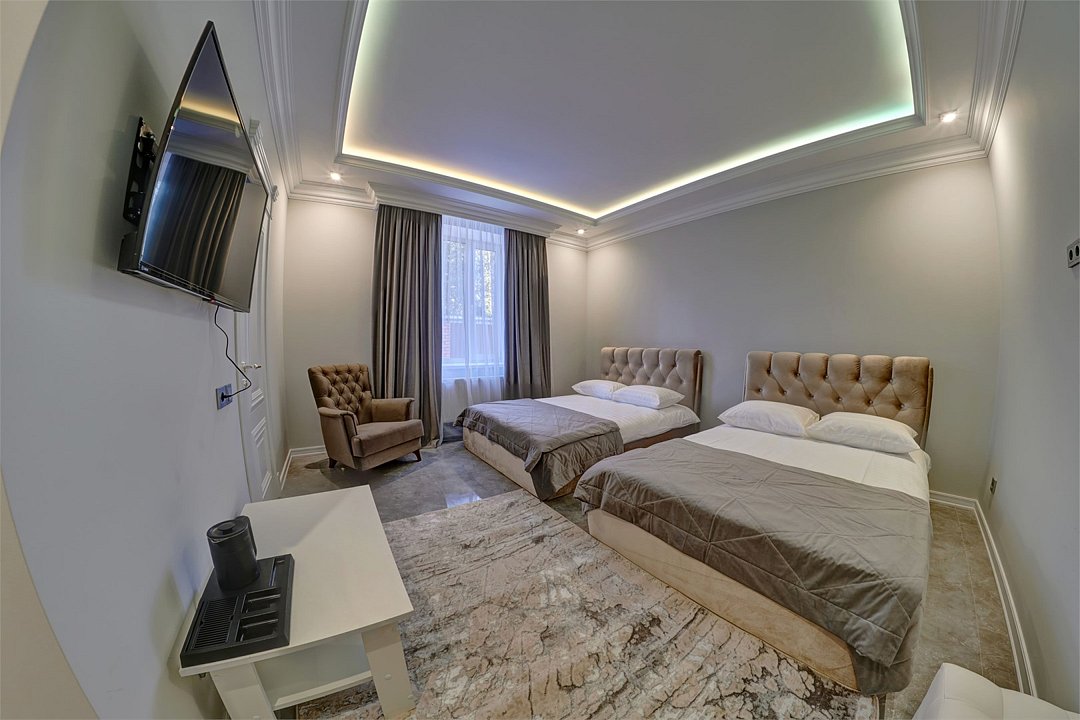 телевизор, спутниковое телевидение, Wi-Fi, интернет, кондиционер, настольные лампы, фен, душевая кабина, теплый пол, халаты, банные полотенца, тапочки, двуспальная кровать, тумбы, вешалки, эксклюзивная мебель, унитаз, раковина, вид во двор, телевизор с плоским экраном, гостиничная парфюмерия, телевизор со Smart TV, туалетные принадлежности премиум-класса, шапочка для душа, мыло, затемняющая штора, Android TVВ номере
