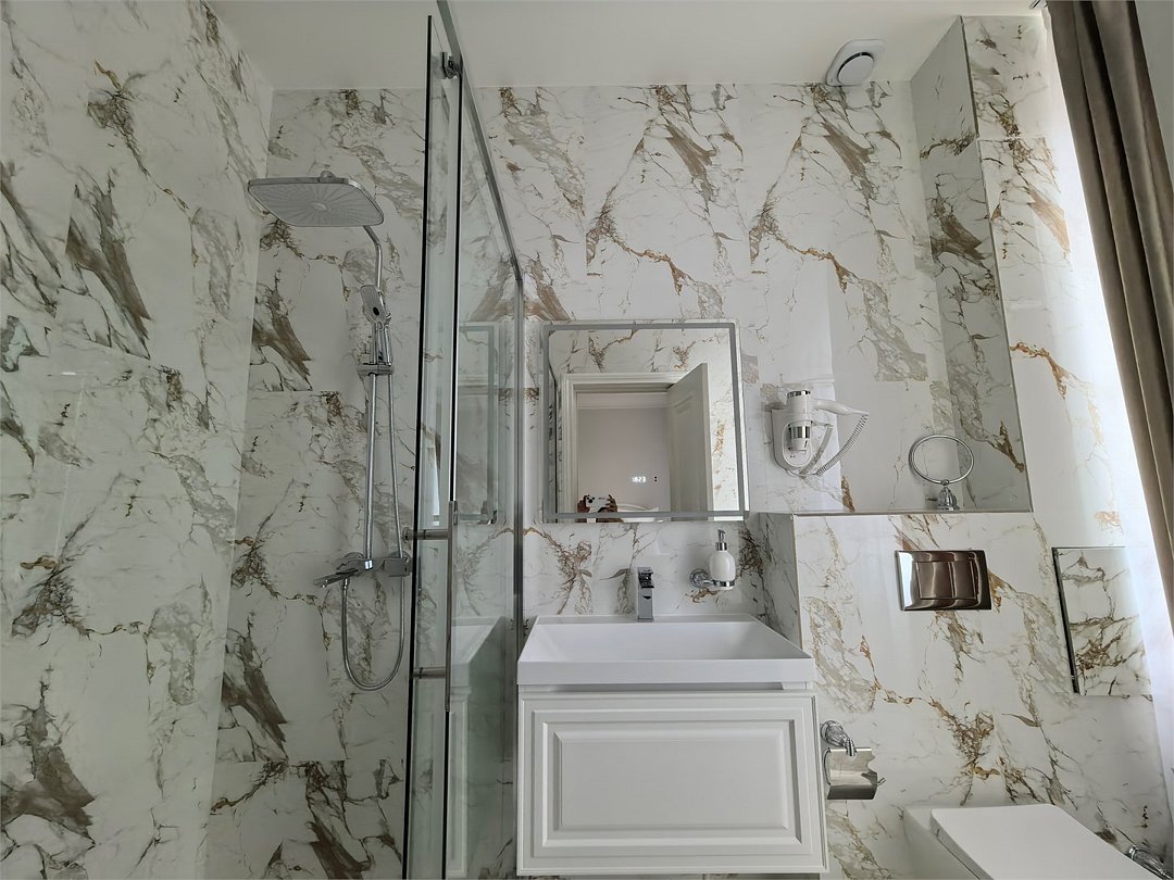 спутниковое телевидение, Wi-Fi, интернет, кондиционер, настольные лампы, фен, душевая кабина, теплый пол, халаты, банные полотенца, косметические средства, полутораспальная кровать, односпальная кровать, вешалки, зеркало, унитаз, раковина, вид во двор, туалет, телевизор с плоским экраном, гостиничная парфюмерия, телевизор со Smart TV, туалетные принадлежности премиум-класса, шапочка для душа, затемняющая штора, Android TVВ номере