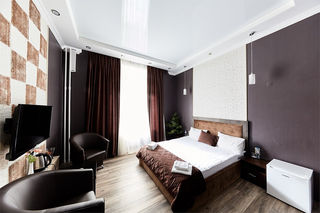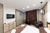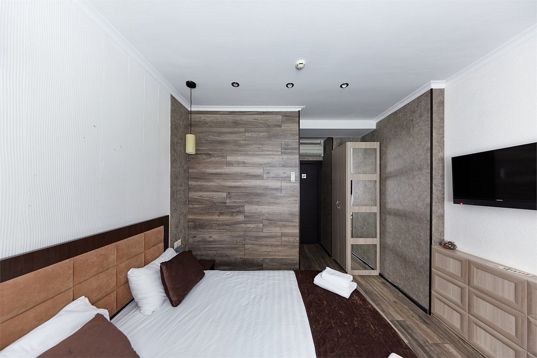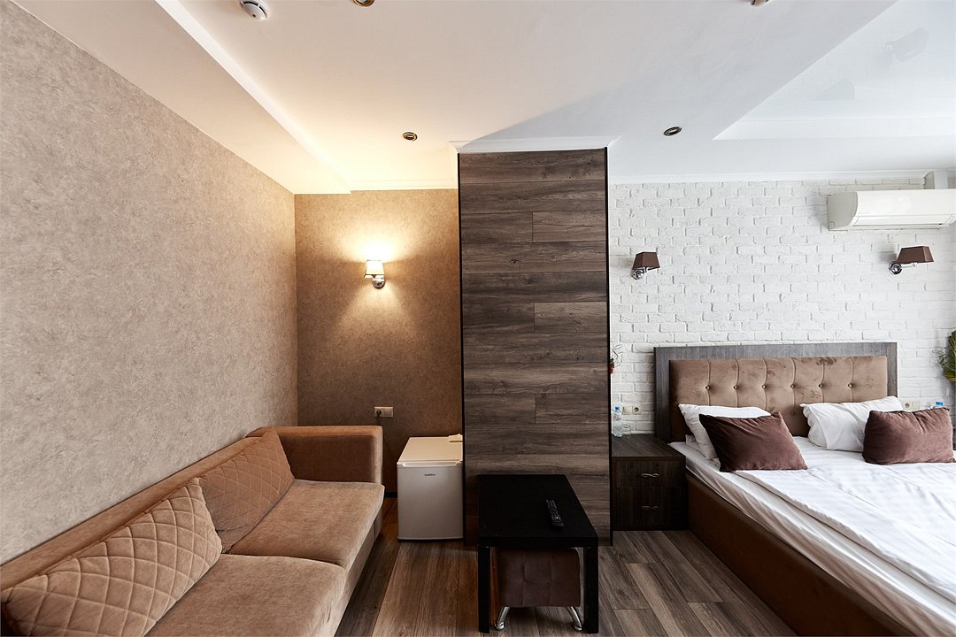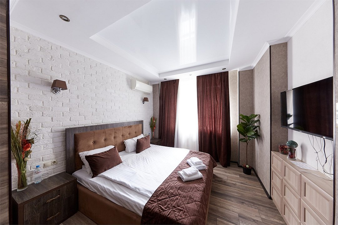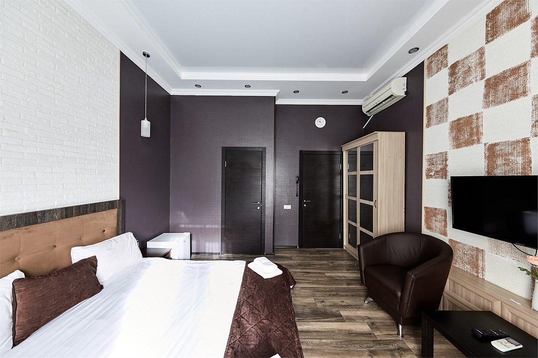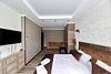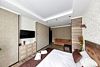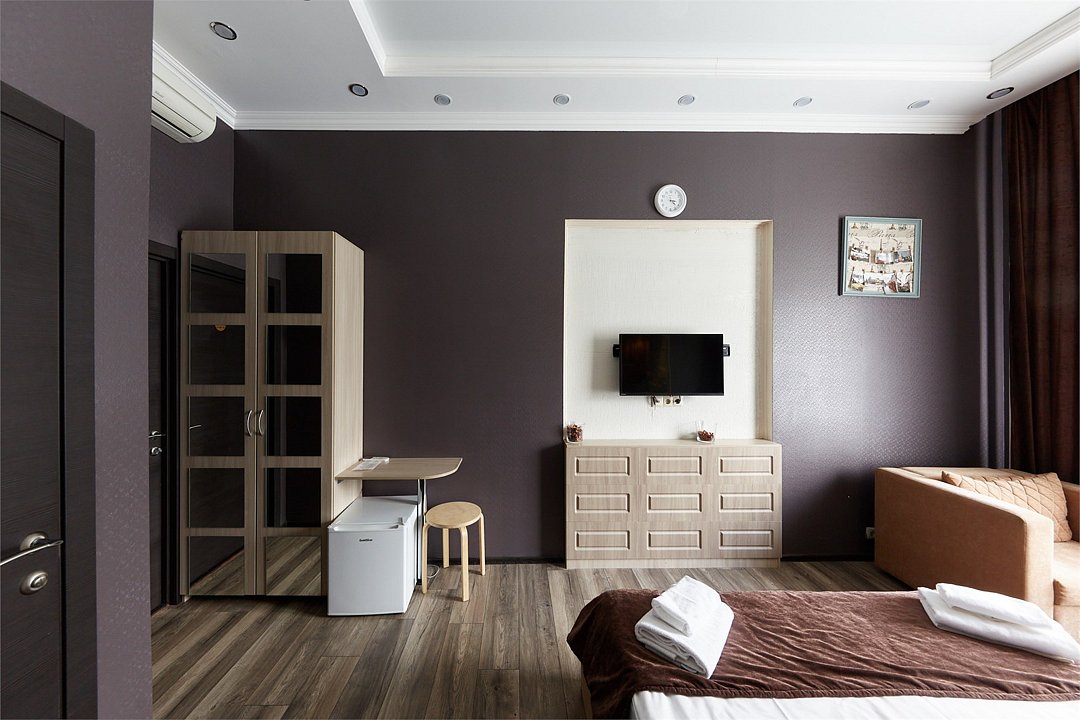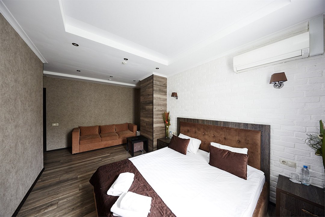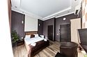 Максимально удобный и просторный номер. В номере широкая двухспальная кровать, диван, стол, прикроватные тумбочки, шкаф, холодильник, чайник, телевизор со Smart TV. В ванной комнате душевая кабина, есть фен и зеркало с подсветкой, а также бидеУслуги и удобства