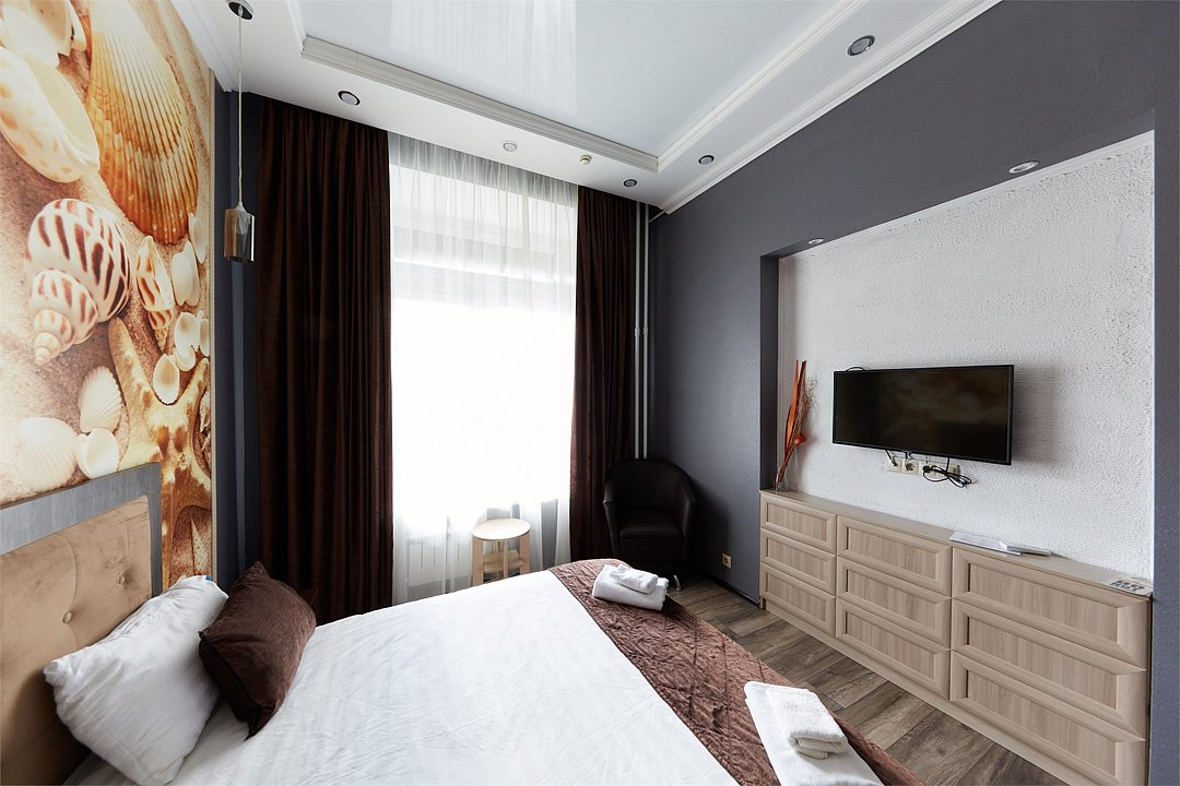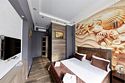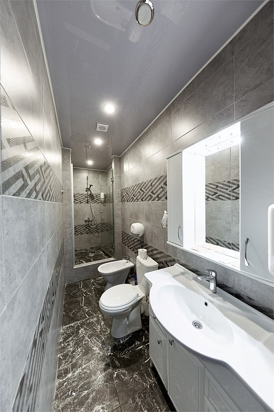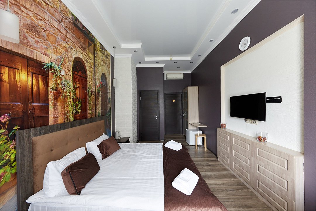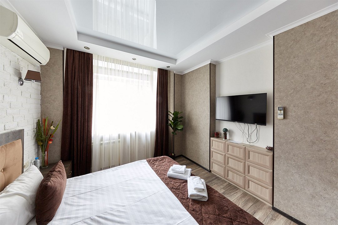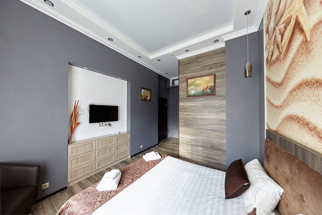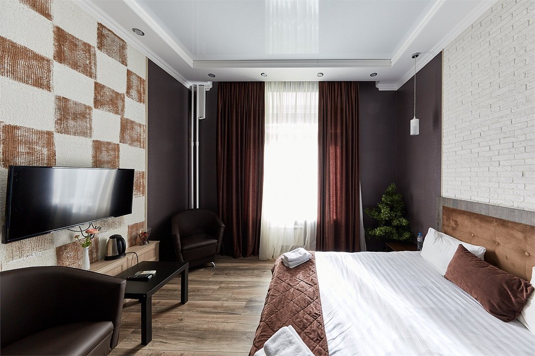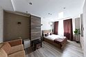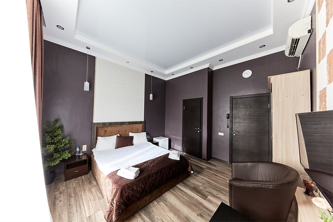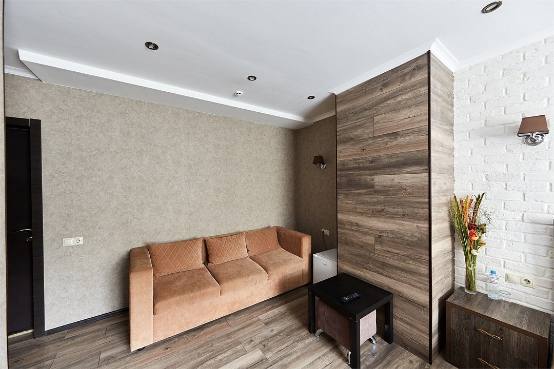Максимально удобный и просторный номер. В номере широкая двухспальная кровать, диван, стол, прикроватные тумбочки, шкаф, холодильник, чайник, телевизор со Smart TV. В ванной комнате душевая кабина, есть фен и зеркало с подсветкой, а также бидеУслуги и удобства