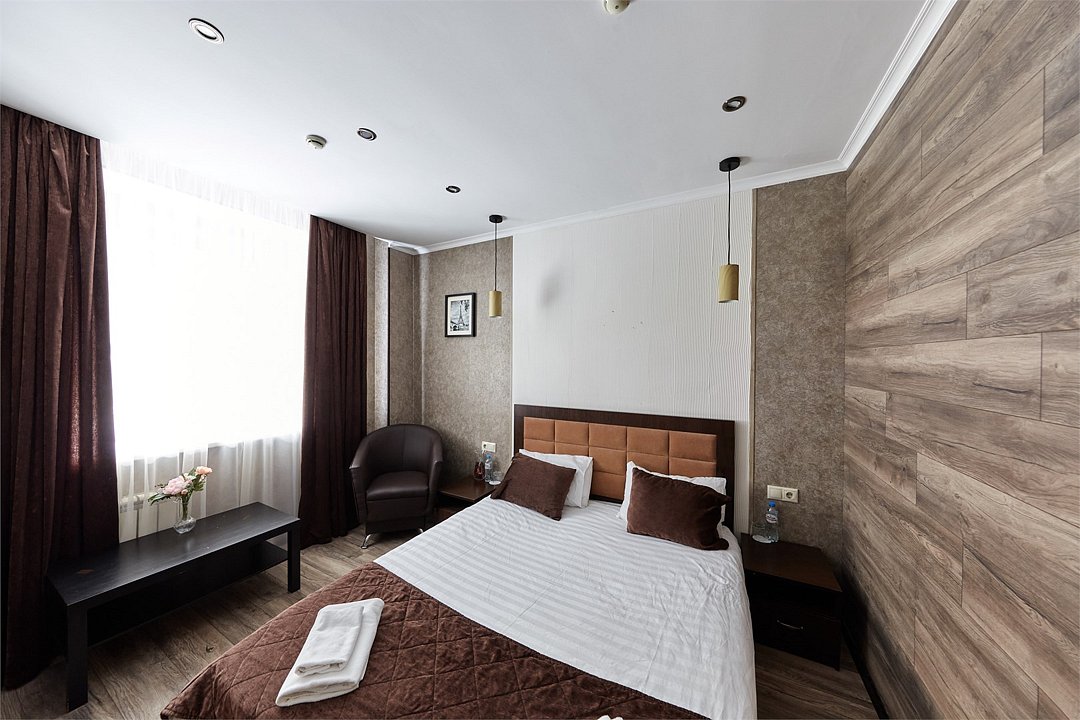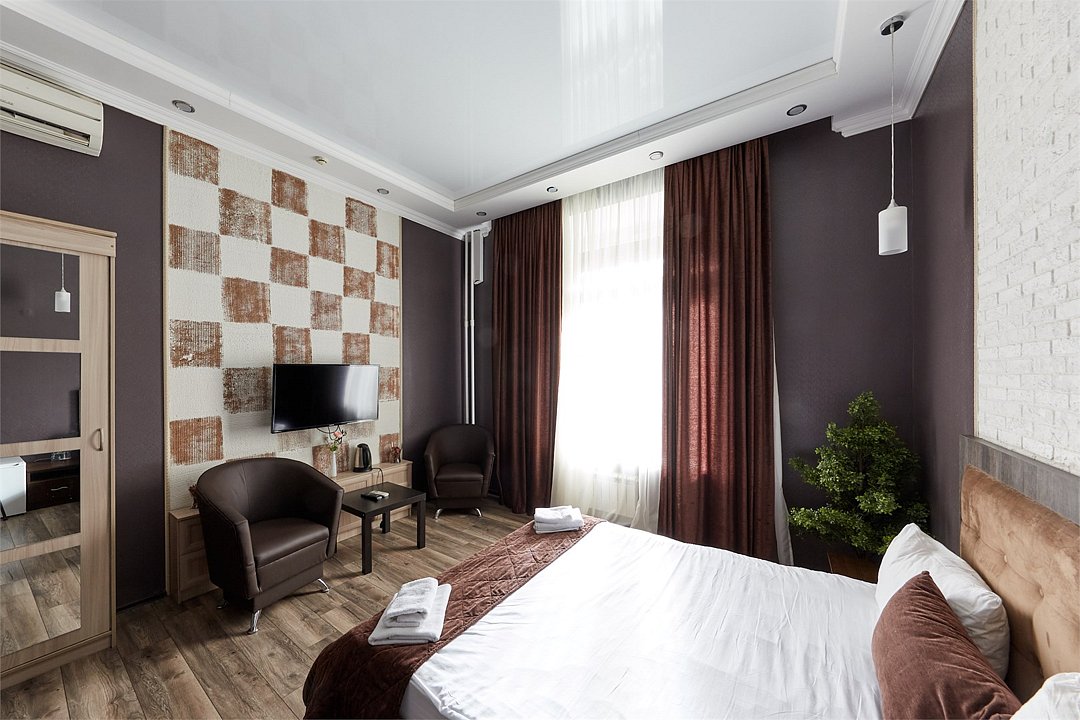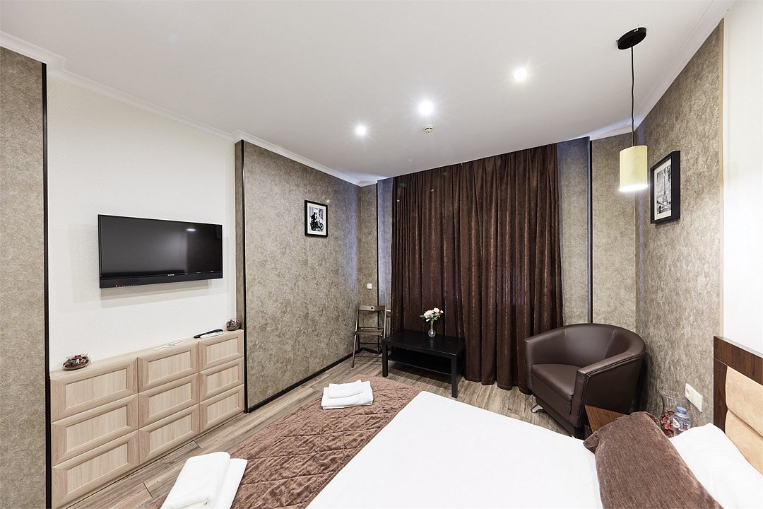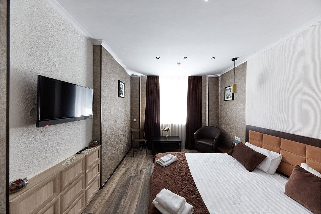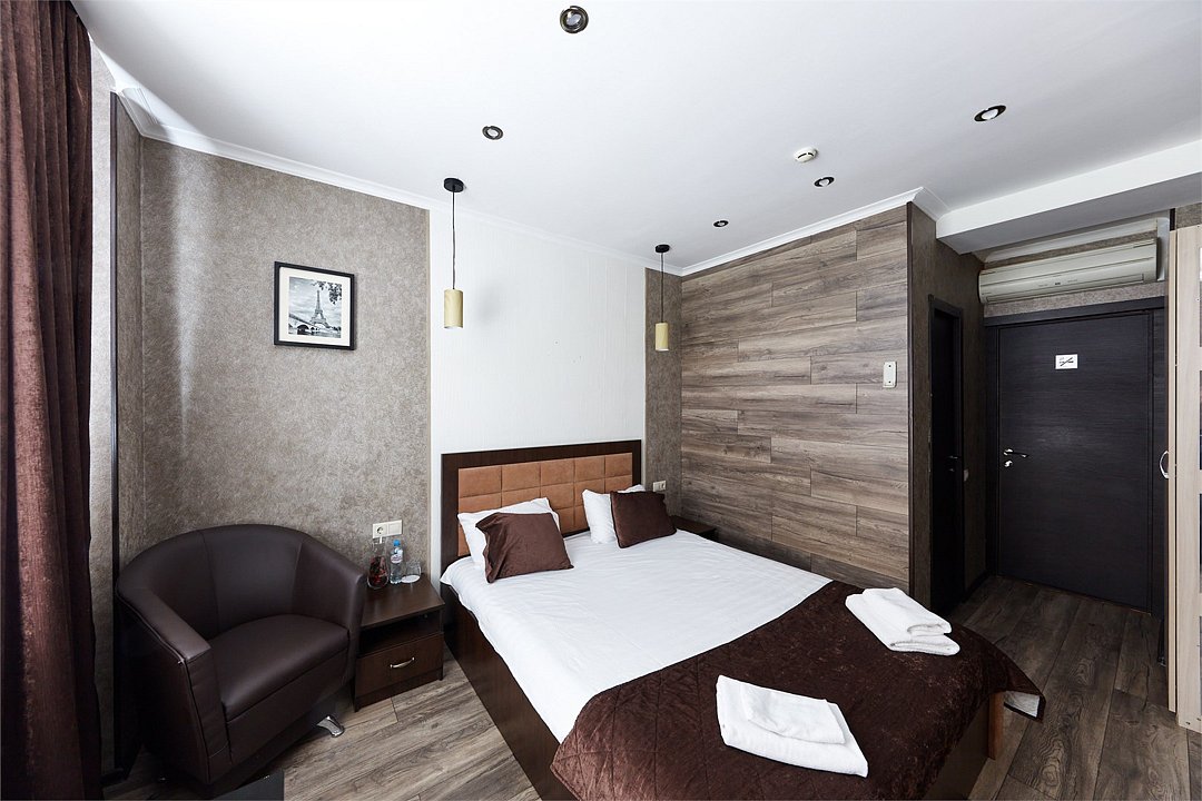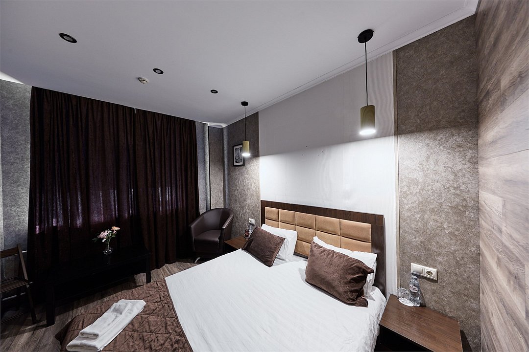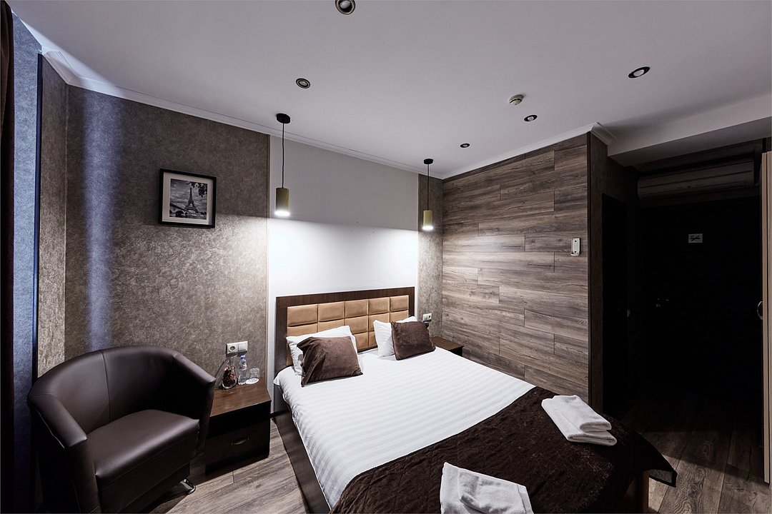 Просторный номер с двухспальной кроватью и двумя креслами. Возможно размещение дополнительного спального места. В номере есть холодильник, прикроватные тумбочки, телевизор со Smart TV, кондиционер. В ванной комнате душевая кабина, биде, фен и зеркалоУслуги и удобства