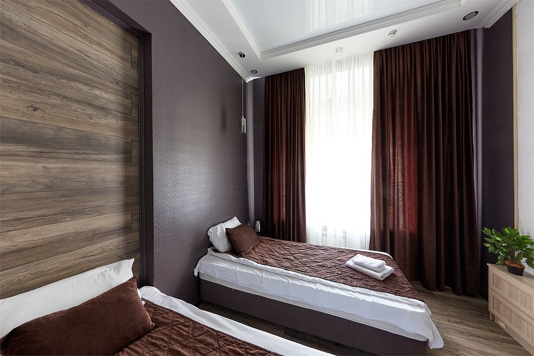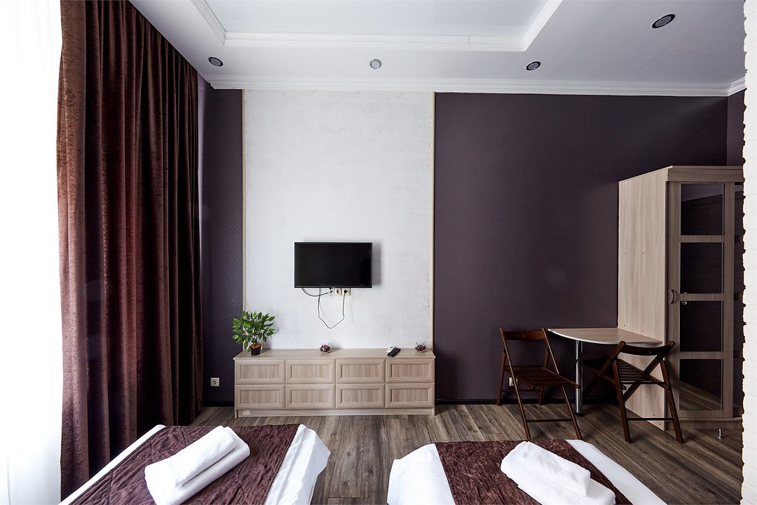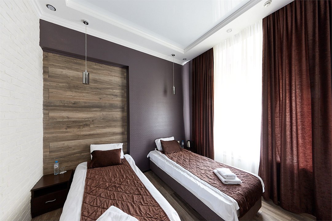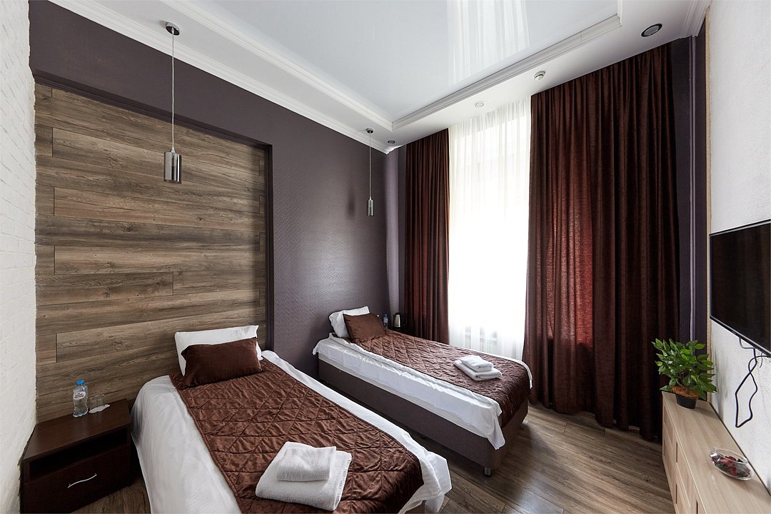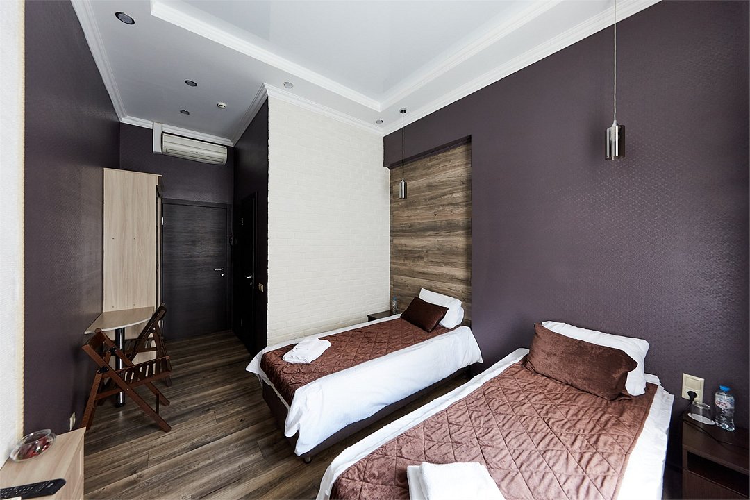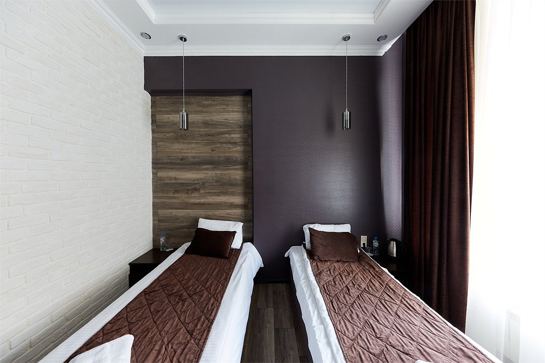 кабельное телевидение, Wi-Fi, кондиционер, светильник, фен, система безопасности, утюг, душевая кабина, санузел, халаты, банные полотенца, тапочки, гигиенические средства, две односпальные кровати, шкаф для одежды, вешалки, зеркало, обслуживание номеров, чайник, отопление, вид на город, вид во двор, ламинат, стол, туалетные средства, мини-холодильник, телевизор со Smart TV, номер для некурящих, рабочий стол, услуги прачечной (платно), затемняющая штораВ гостиничном номере