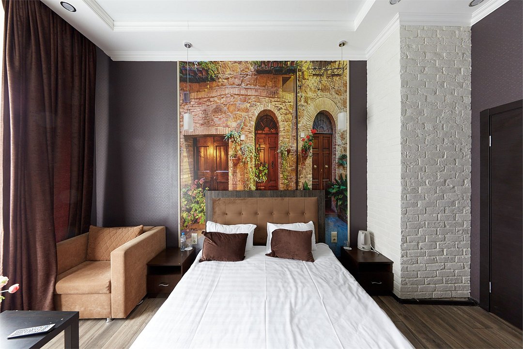кабельное телевидение, Wi-Fi, интернет, кондиционер, фен, система безопасности, утюг, душевая кабина, санузел, биде, халаты, банные полотенца, тапочки, гигиенические средства, тумбы, шкаф для одежды, зеркало, обслуживание номеров, отопление, кресло, вид во двор, ламинат, стол, туалетные средства, туалет, диван-кровать, мини-холодильник, телевизор со Smart TV, номер для некурящих, пуфик, кровать «Super king size», уборка номера, услуги прачечной (платно), бутилированная вода, затемняющая штораВ гостиничном номере