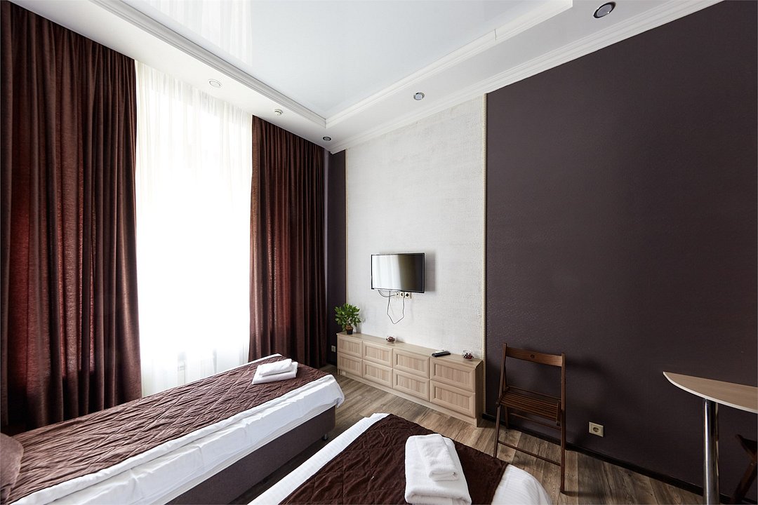 кабельное телевидение, Wi-Fi, кондиционер, светильник, фен, система безопасности, утюг, душевая кабина, санузел, халаты, банные полотенца, тапочки, гигиенические средства, две односпальные кровати, шкаф для одежды, вешалки, зеркало, обслуживание номеров, чайник, отопление, вид на город, вид во двор, ламинат, стол, туалетные средства, мини-холодильник, телевизор со Smart TV, номер для некурящих, рабочий стол, услуги прачечной (платно), затемняющая штораВ номере