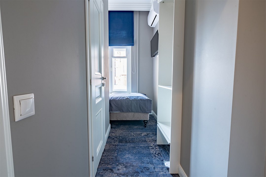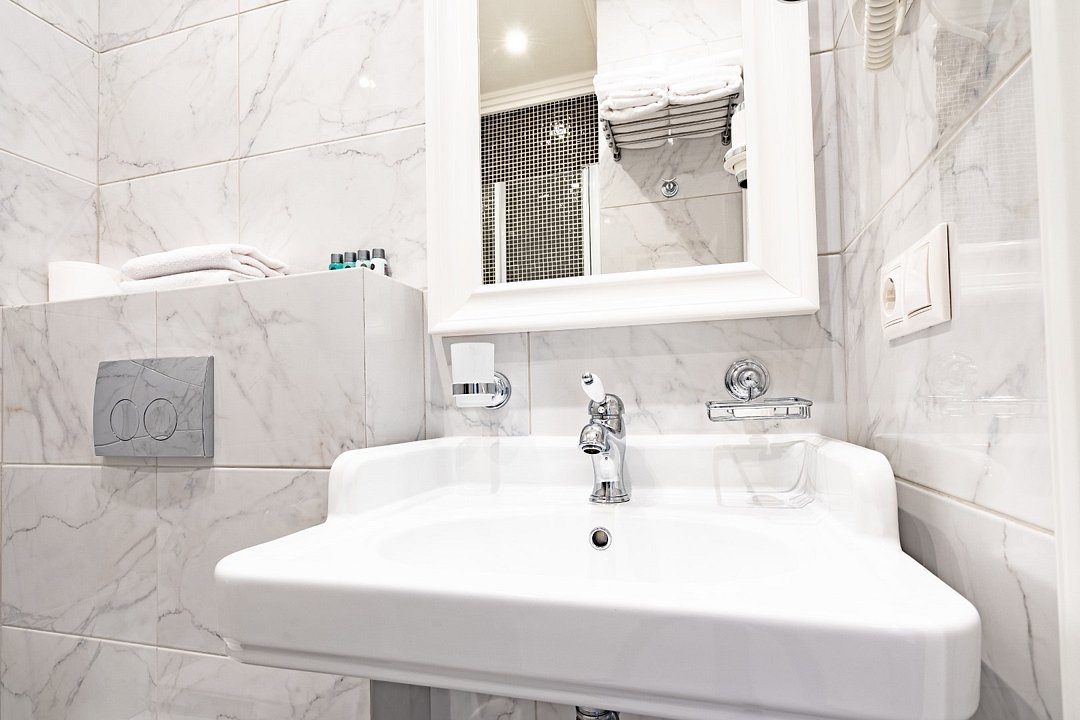 телевизор, Wi-Fi, кондиционер, халаты, тапочки, гигиенические средства, косметические средства, односпальная кровать, шкаф для одежды, багажная тумба, зеркало, эксклюзивная мебель, унитаз, раковина, душ, тумбаВ гостиничном номере
