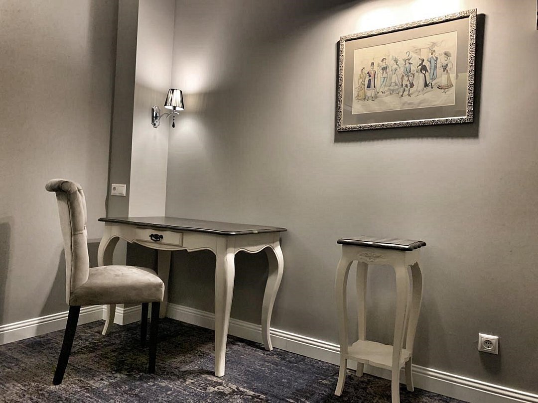 спутниковое телевидение, Wi-Fi, светильник, фен, весы, утюг, халаты, тапочки, гигиенические средства, две односпальные или большая двуспальная кровать, шкаф для одежды, вешалки, багажная тумба, зеркало, эксклюзивная мебель, мини-бар, свежая пресса, информационная карта, меню, сейф, унитаз, раковина, питьевая вода, отопление, душ, вид на город, кулер на этаже, высокие потолки, стиральная машина и сушилка, тумба, сплит-система, мини-холодильник, гостиничная парфюмерия, телевизор со Smart TV, номер для некурящихВ гостиничном номере