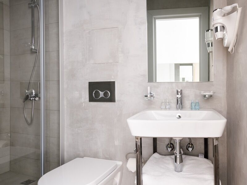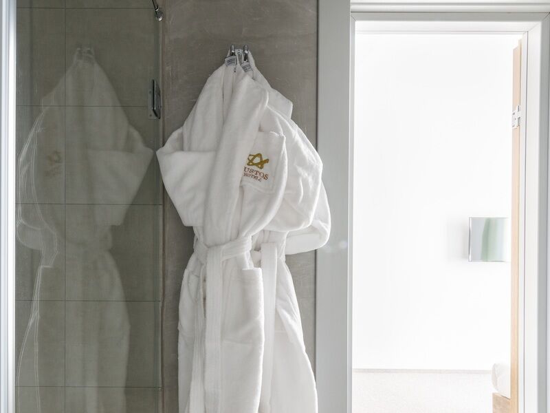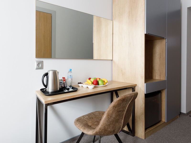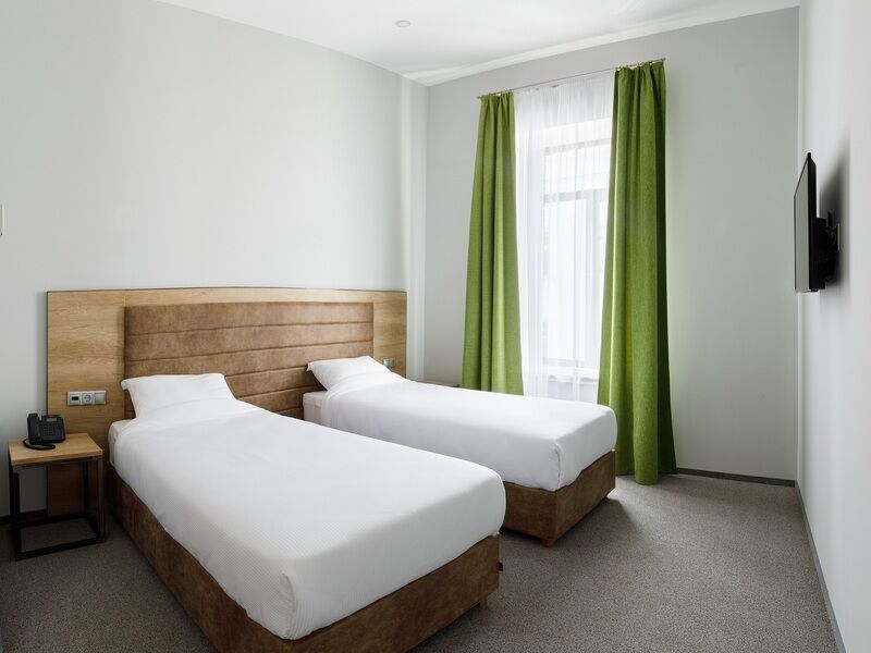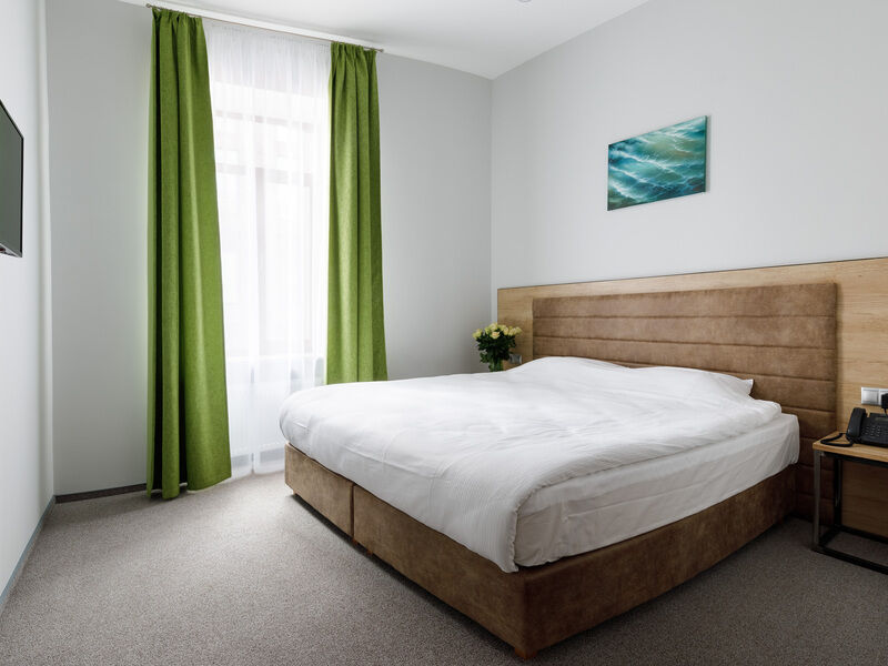 В номерах стильный лаконичный, преимущественно светлый интерьер, который разбавляют акцидентные оливковые оттенки. Номера оснащены сплит-системой, везде есть телевизор-ЖК, фен, электрочайник. В ванной комнате отдыхающих ожидает подготовленный набор косметических принадлежностей.