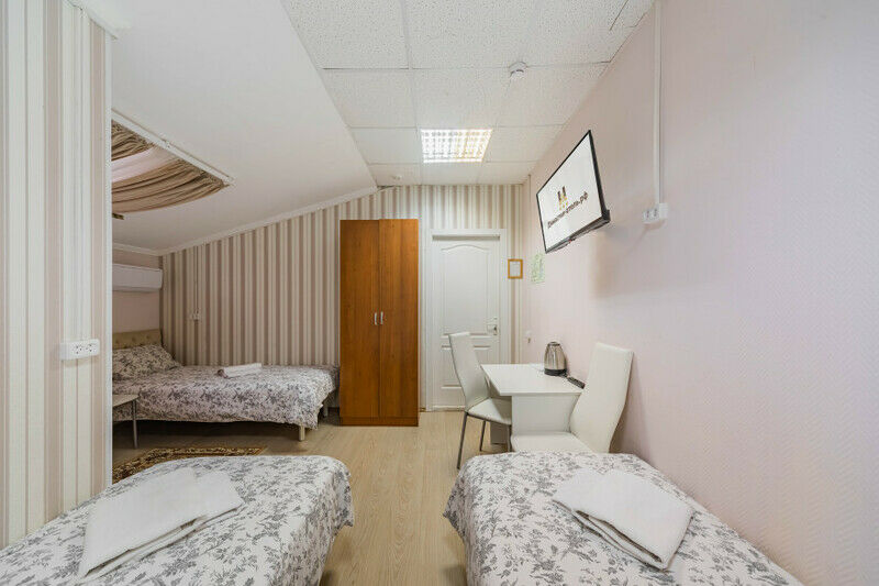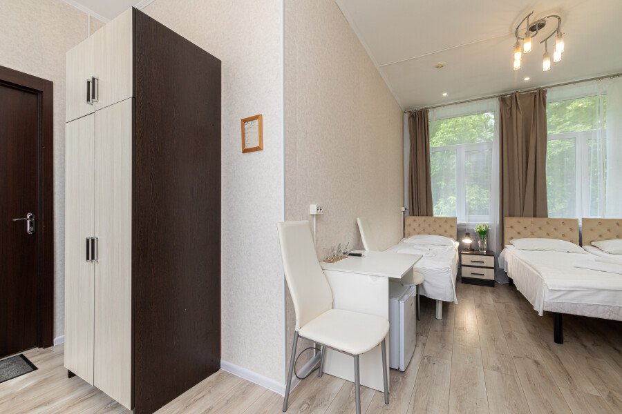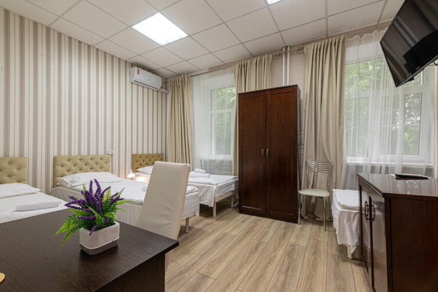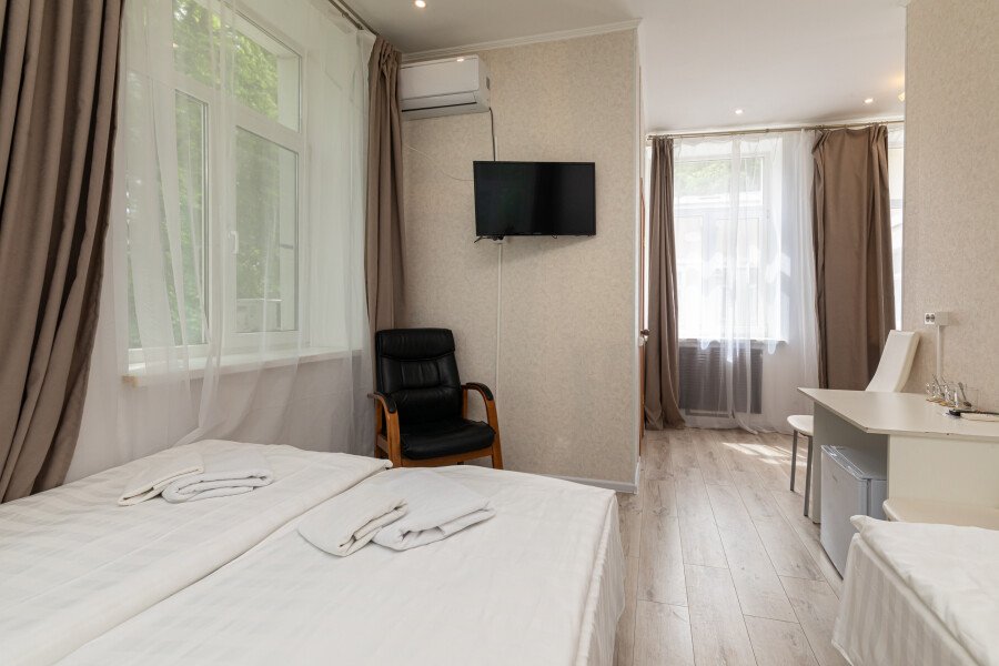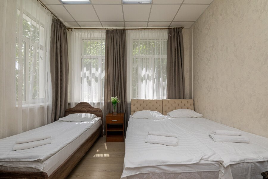 Номер с 3 односпальными кроватями с комфортными ортопедическими матрасами. В номере имеется собственная ванная комната, вся необходимая мебель и техника для комфортного проживания. В стоимость номера входит высокоскоростной wi-fi.