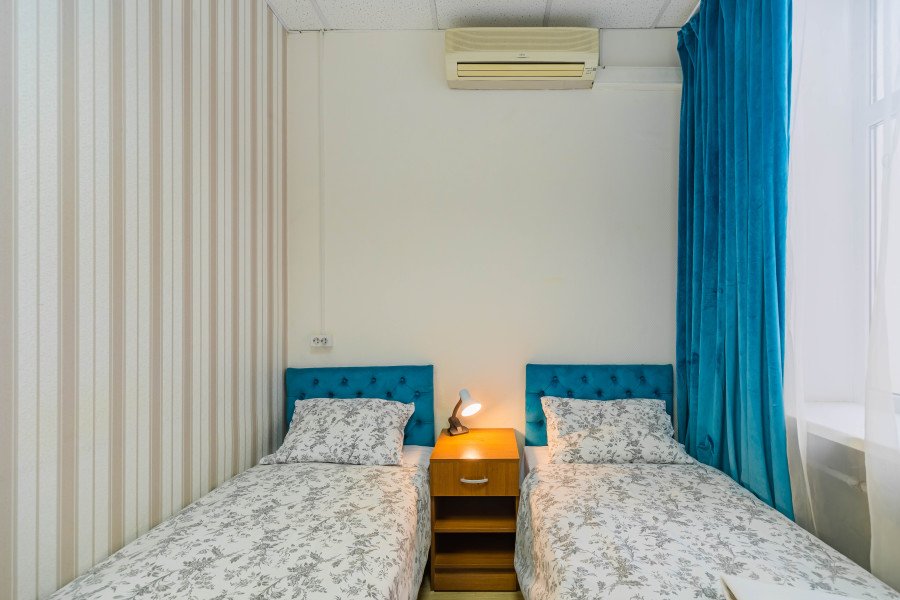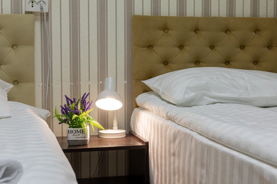 Двухместный номер с 2 односпальными кроватями отлично подойдёт для проживания двоих коллег во время командировки или для путешествия с другом. В номере есть все удобства, собственная ванная комната, 2 кровати, шкаф, стол, стулья, телевизор, кондиционер, кресло, яркое освещение, тапочки, полотенца, постельное белье.