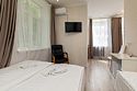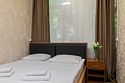Номер с двуспальной кроватью, собственной ванной комнатой и всем удобствами. В номере есть всё необходимое для комфортного проживания, телевизор, кондиционер, холодильник, гигиенический набор, тапочки, полотенца и постельное белье. Уборка производится ежедневно, можно отдельно взять в аренду халат.