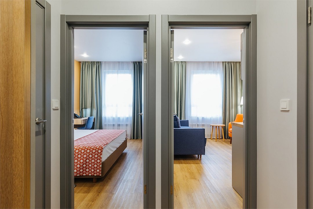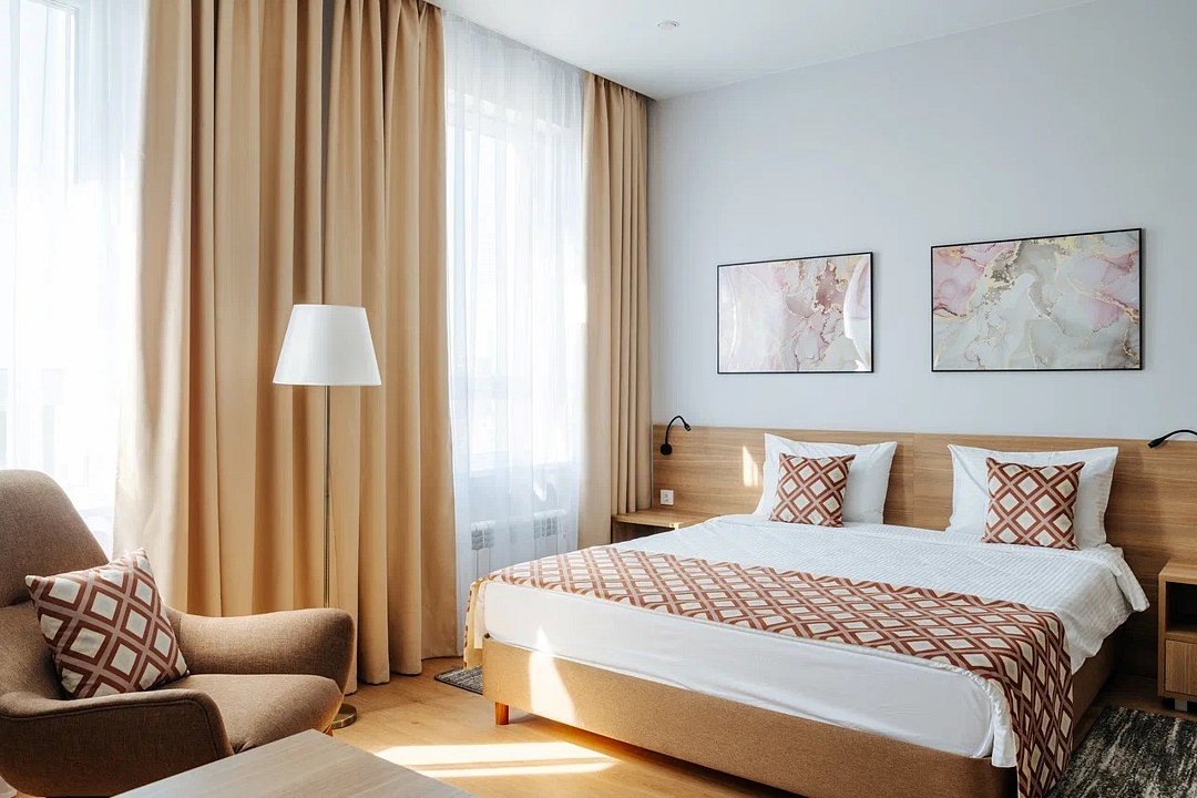 Апартаменты «Двухкомнатный Бизнес» имеют отдельную спальню и кухню-гостиную. В нем могут комфортно проживать до 3-х человек. Эту категорию апартаментов по достоинству оценят гости требовательные к комфорту.Услуги и удобства