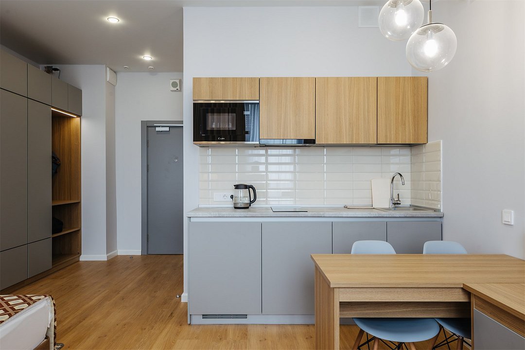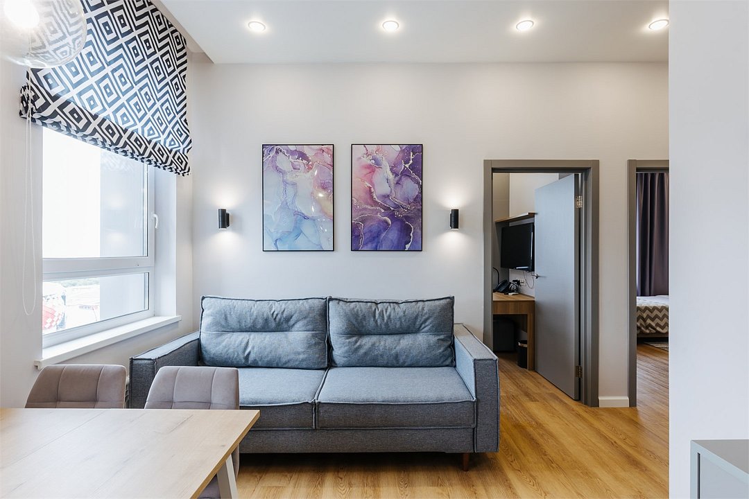 Апартаменты «Студия Стандарт» идеально подойдут для проживания 1-2 человек. Интерьер выполнен в светлых тонах. Мебель изготовлена по индивидуальному заказу и каждый элемент продуман до мелочей.Услуги и удобства