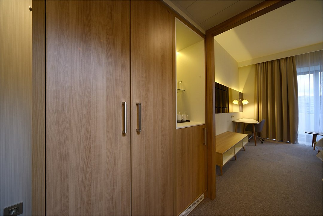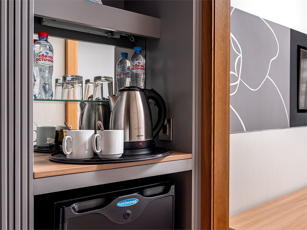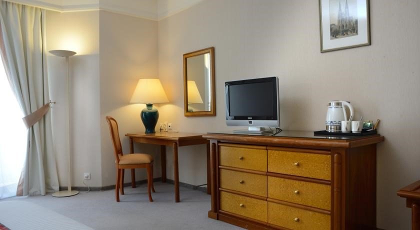 телевизор, Wi-Fi, фен, утюг, ванна или душевая кабина, халаты, банные полотенца, тапочки, косметические средства, балкон, две односпальные или большая двуспальная кровать, шкаф для одежды, сейф, чайник, стаканы, туалет, внутренний телефон, фанкойл, рабочий стол, зеркало в полный рост, можно с питомцамиВ гостиничном номере