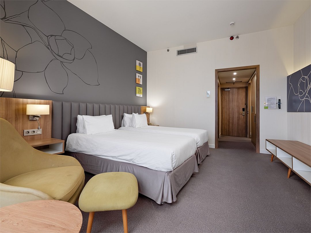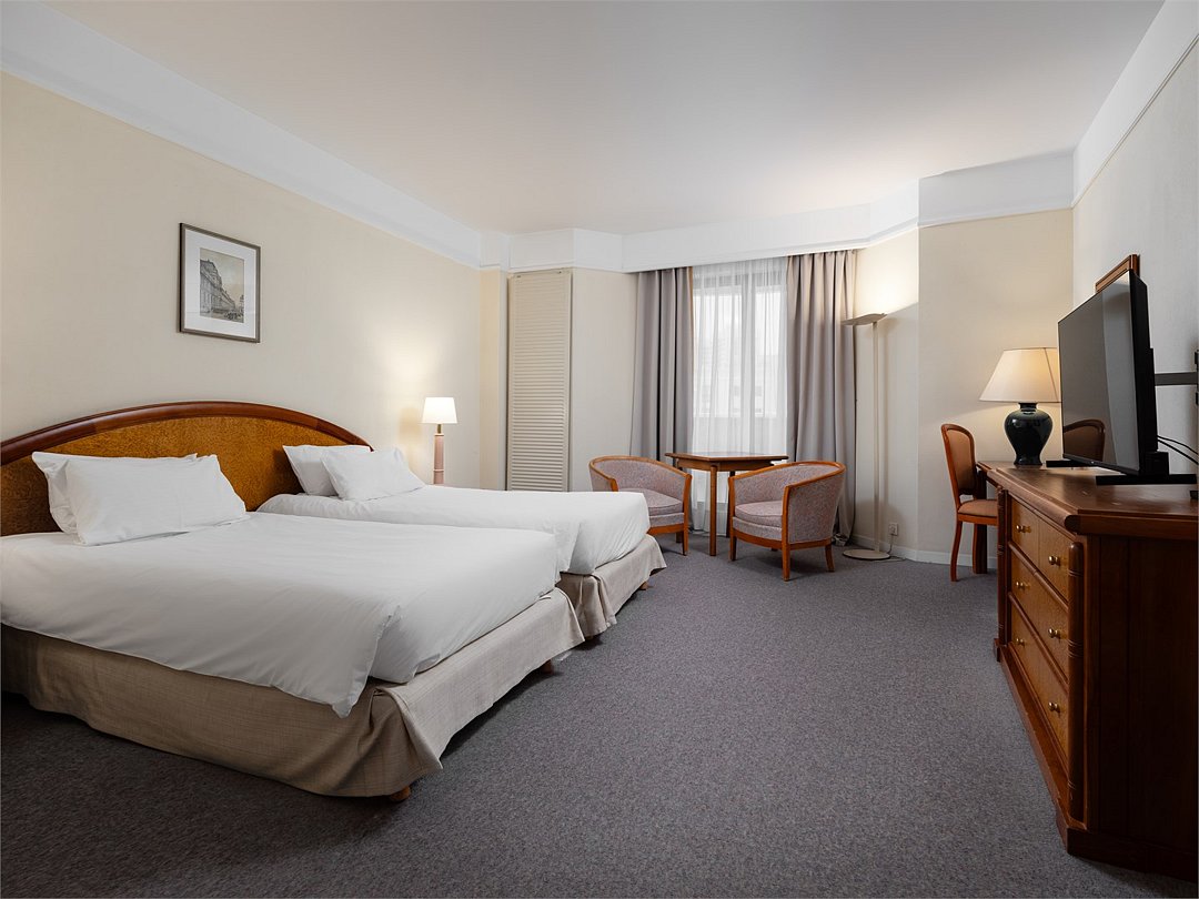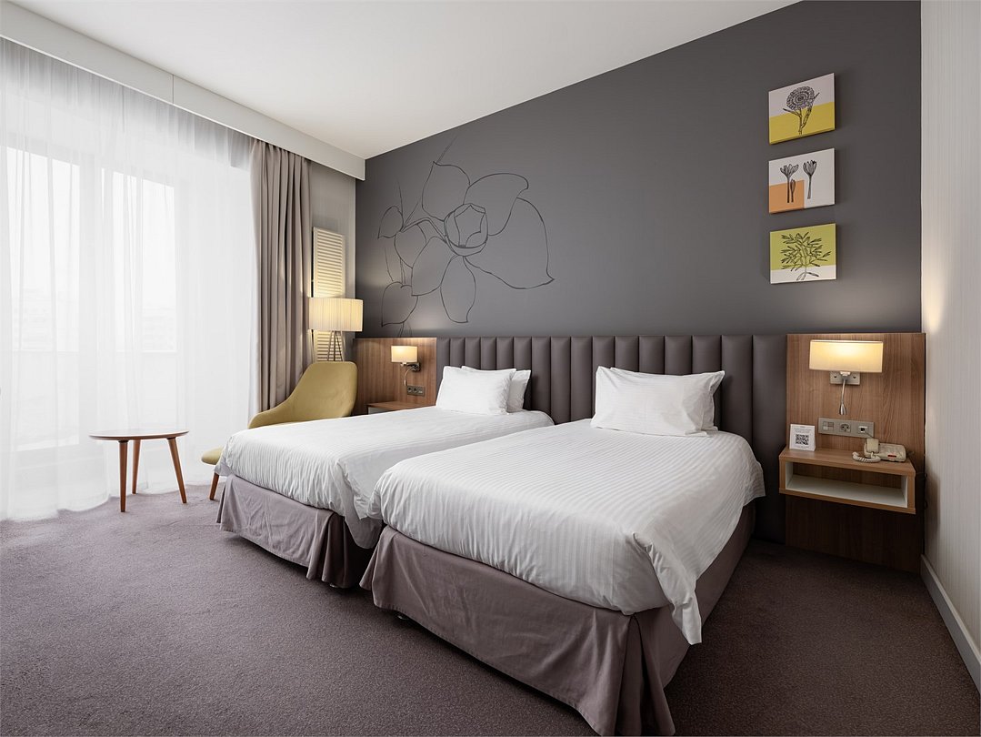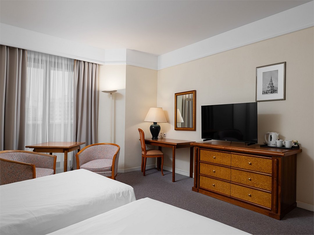 Просторный и уютный стандартный номер с 2 раздельными кроватями площадью 30 м² идеально подходит как для деловых путешественников, так и для отдыха. К услугам гостей ванная комната с ванной и биде, рабочее место, журнальный стол с удобными креслами, бесплатный Wi-Fi и все необходимое для комфортного проживания.Услуги и удобства