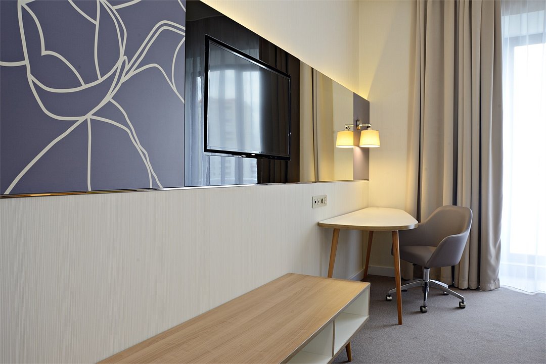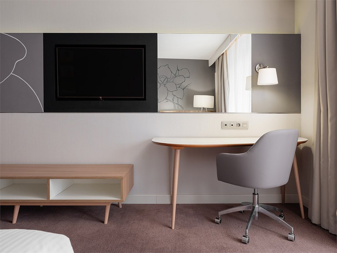 кабельное телевидение, Wi-Fi, телефон, настольные лампы, фен, электронные замки, утюг, ванна, санузел, кровать «Queen size», гладильная доска, шкаф для одежды, вешалки, зеркало, сейф, раковина, вид на город, стул, стол, тумба, телевизор с плоским экраном, фанкойл, чайная станция, можно с питомцамиВ гостиничном номере