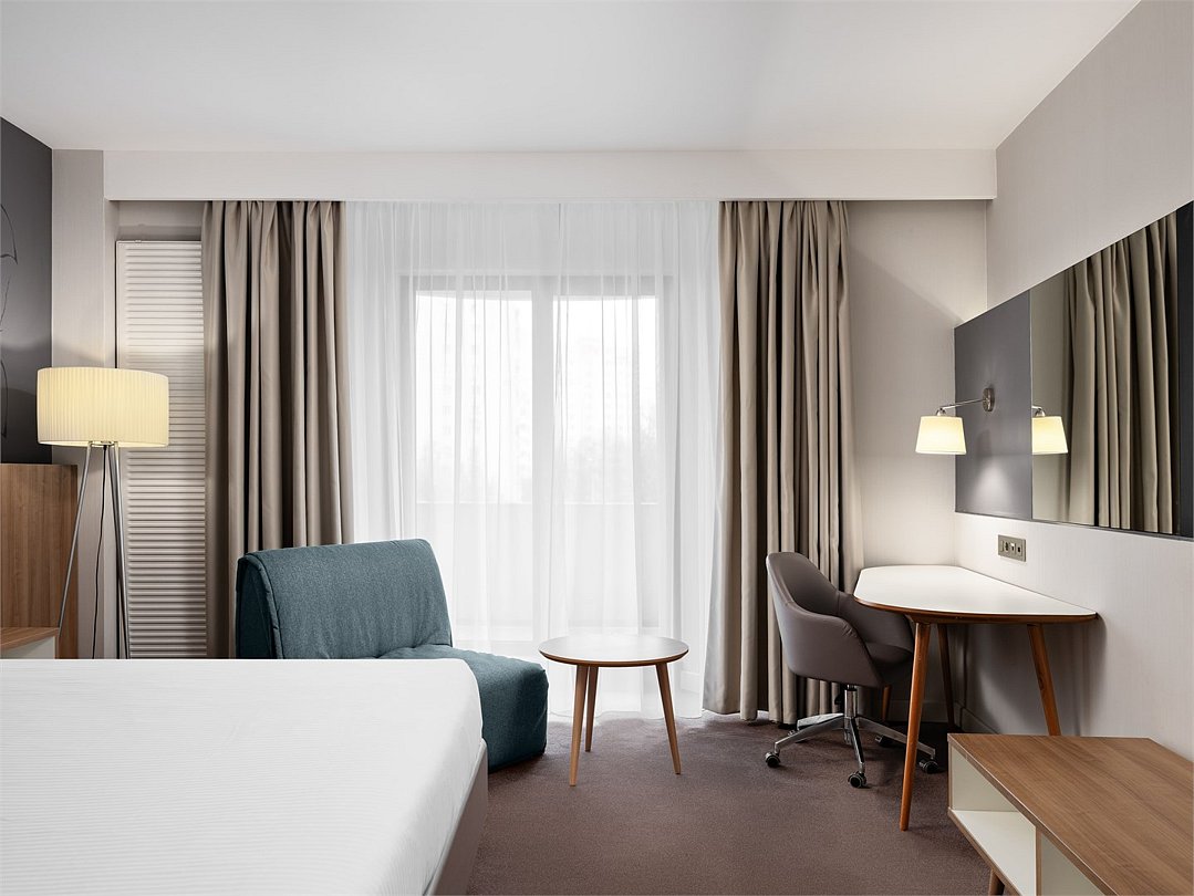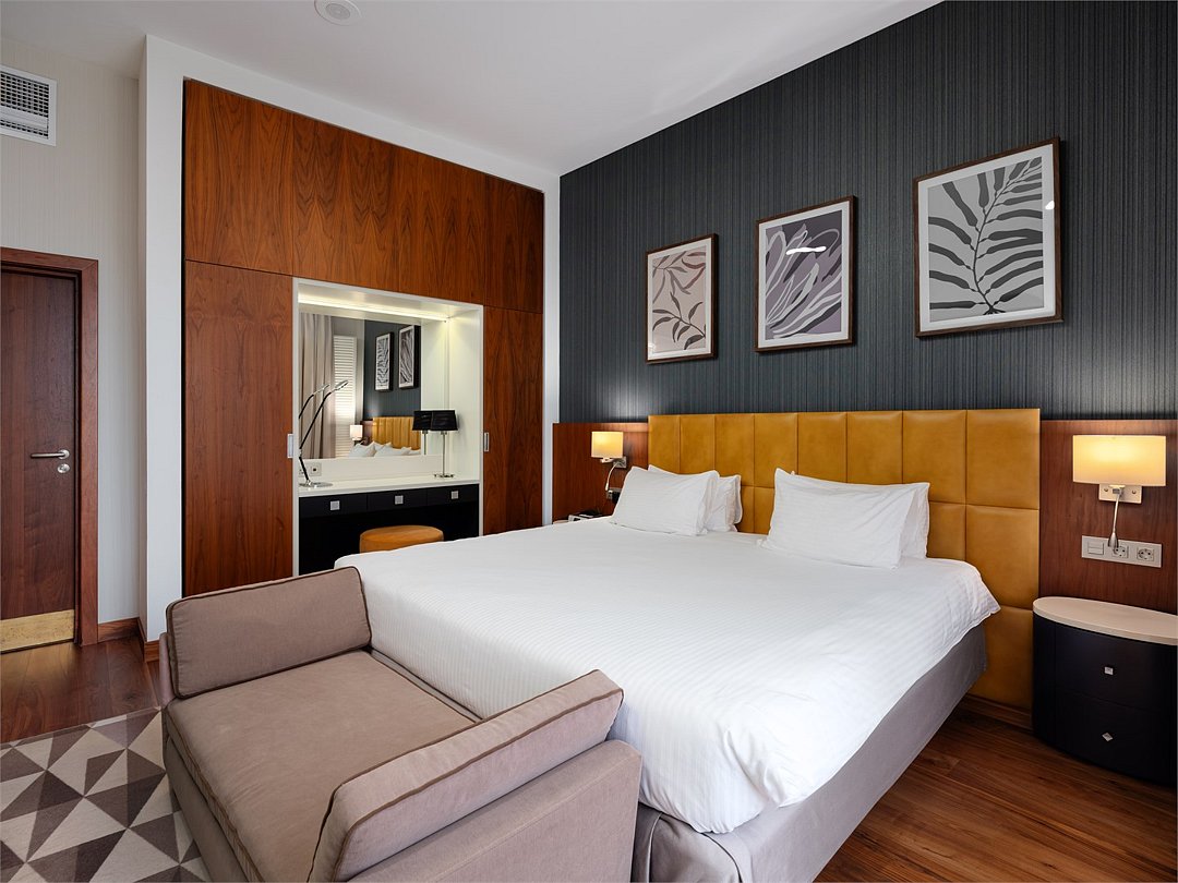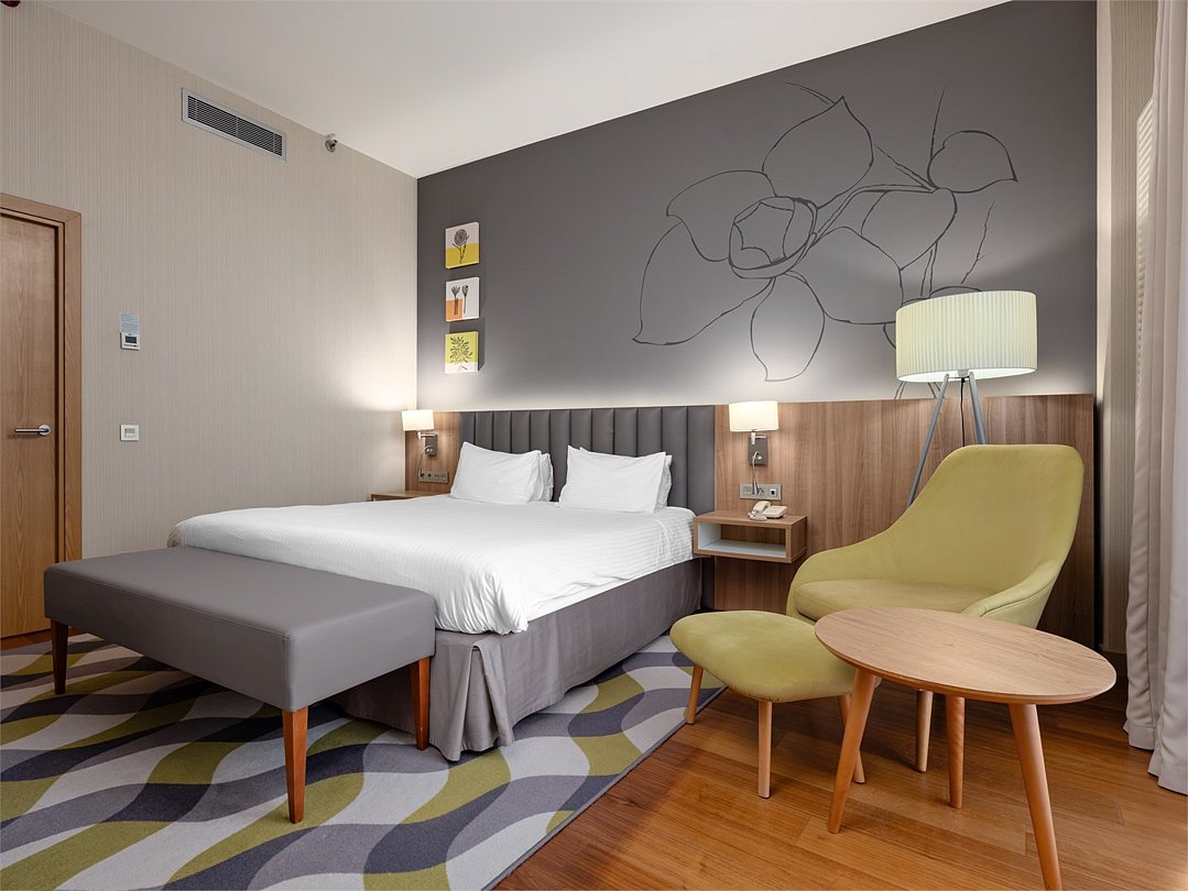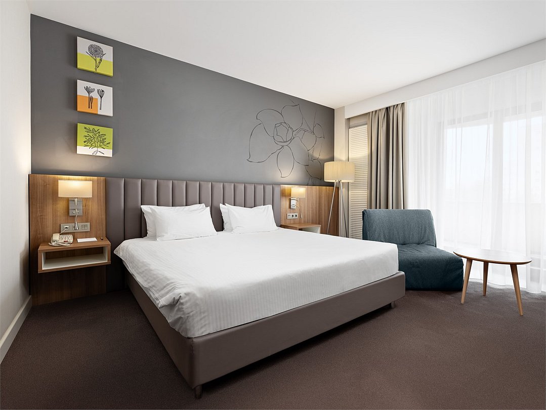 Улучшенный номер с удобной двуспальной кроватью размера King-size площадью 30 м2 идеально подходит для отдыха после тяжелого дня или длительного путешествия. Насладитесь чашечкой ароматного кофе, приготовленного в кофе-машине и почитайте книгу, расположившись в комфортабельном кресле. Ежедневно с 12:00 до 22:00 в Вашем распоряжении Клубная гостиная с легкими закусками и напитками, где можно полностью расслабиться и отдохнуть от городской суеты.Услуги и удобства