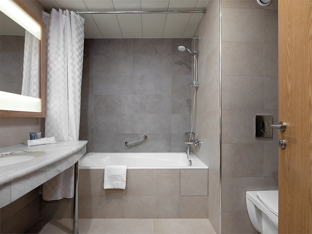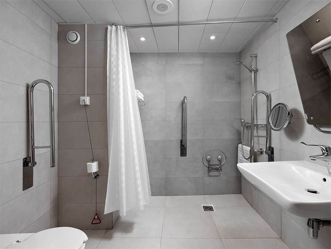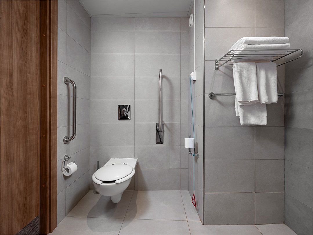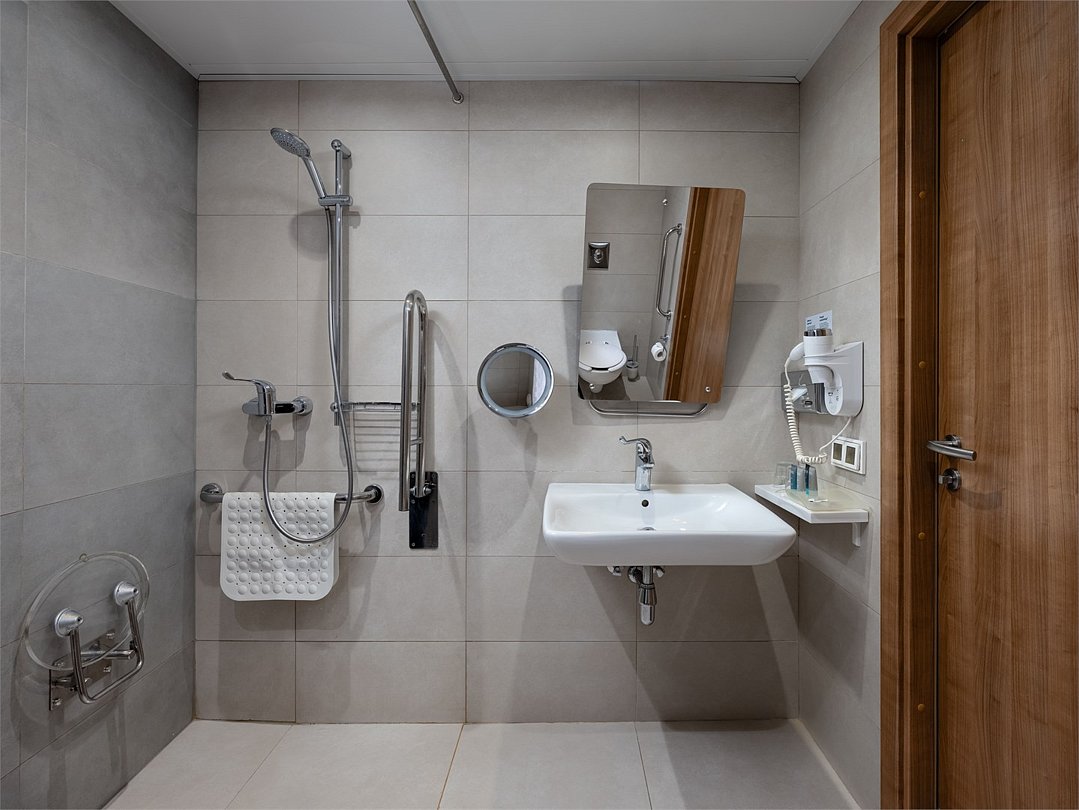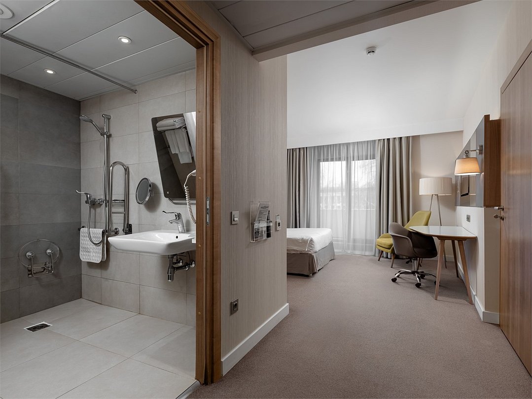 Испытайте чувство максимального комфорта в номере площадью 30 м², оборудованном широкими дверными проемами, удобным душем, кнопками для подачи тревожного сигнала и другими специальными приспособлениями. С удобствами в виде рабочего пространства и большой двуспальной кровати, Вы сможете как продуктивно поработать, так и полностью расслабиться.Услуги и удобства