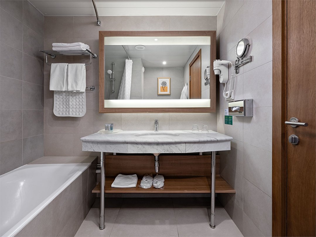 телевизор, Wi-Fi, фен, утюг, ванна или душевая кабина, халаты, банные полотенца, тапочки, косметические средства, балкон, две односпальные или большая двуспальная кровать, шкаф для одежды, сейф, чайник, стаканы, туалет, внутренний телефон, фанкойл, рабочий стол, зеркало в полный ростВ номере