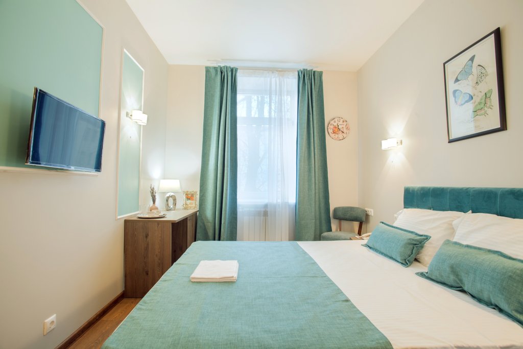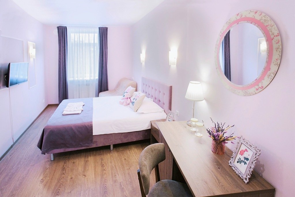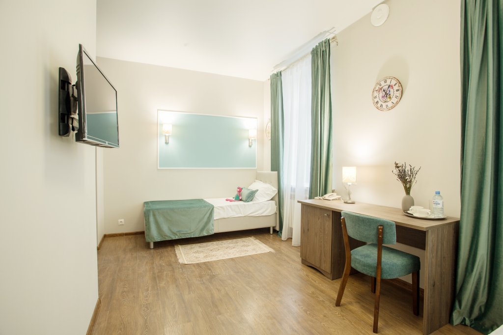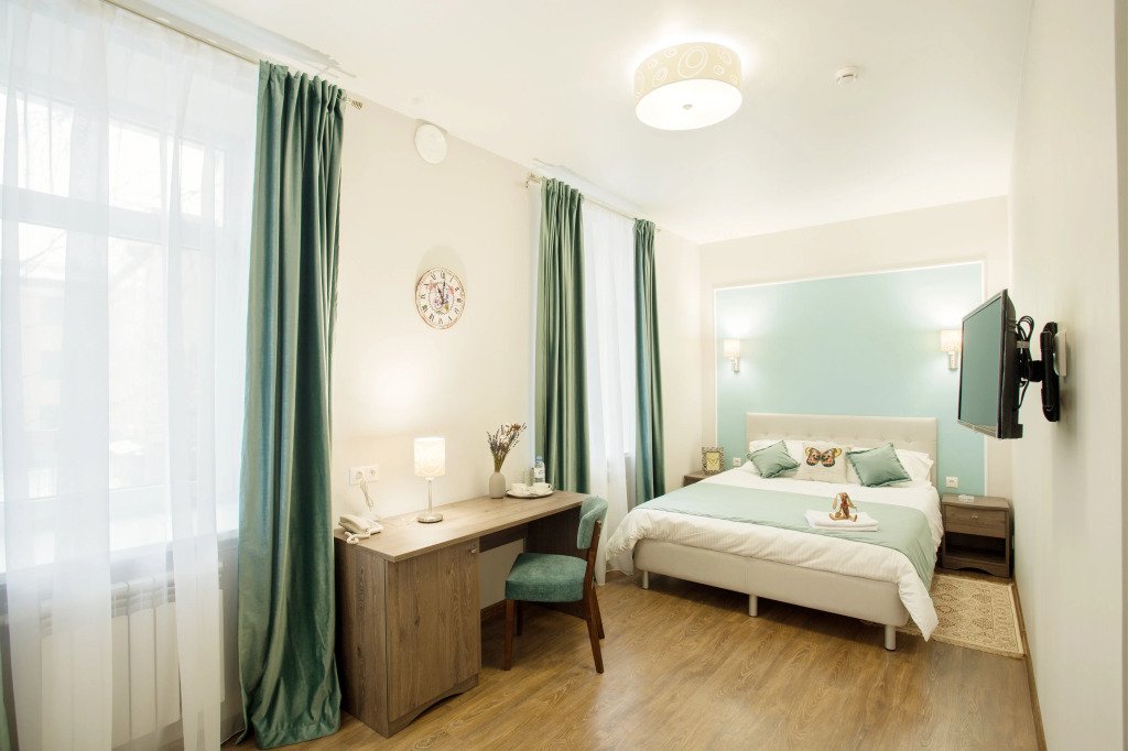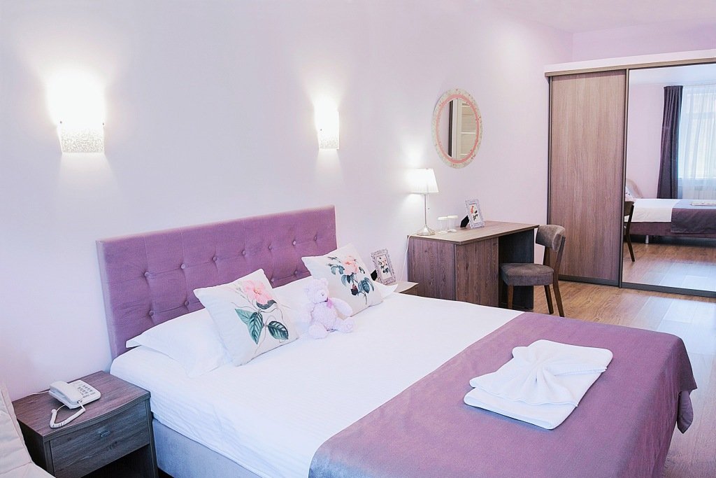 Номер уютно обставлен и оснащён необходимым, чтобы отдохнуть после долгого и насыщенного дня. Имеются телевизор и халат. Оснащение зависит от выбранной категории номера.