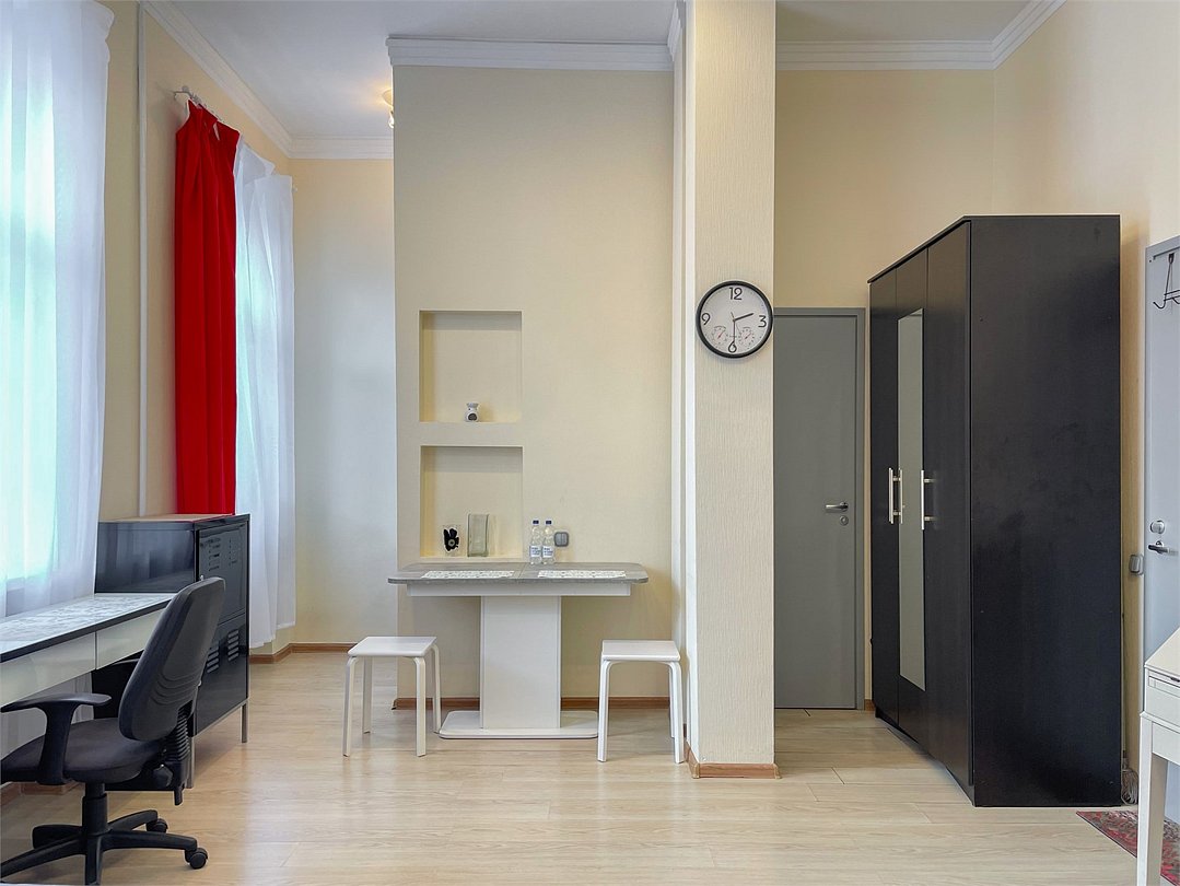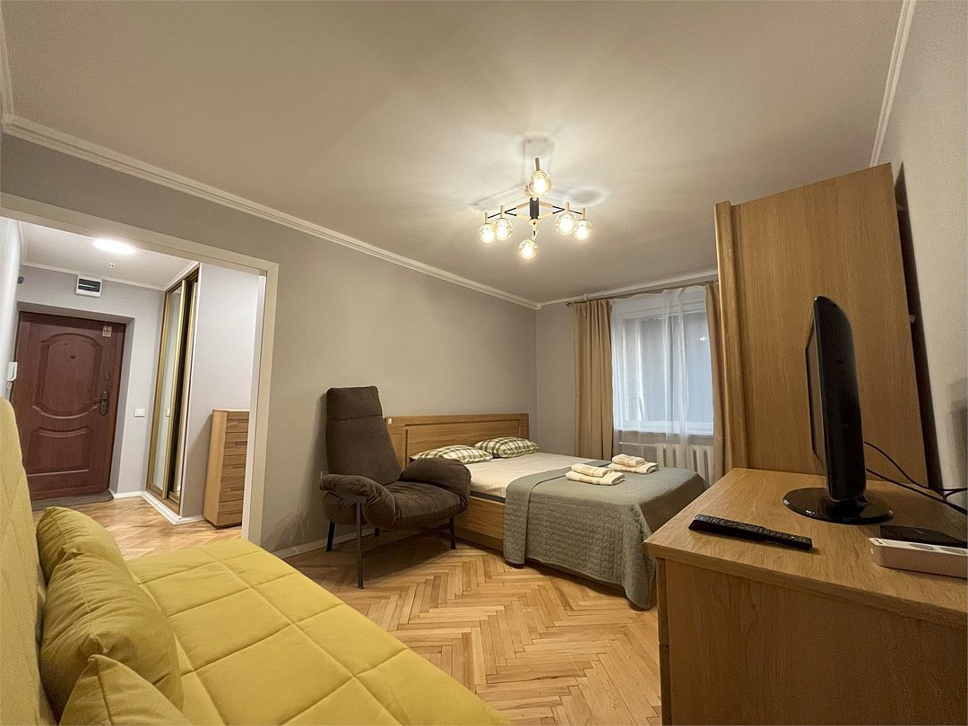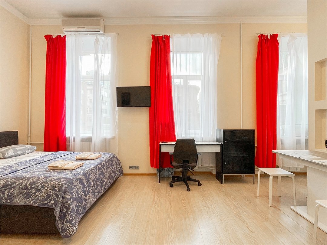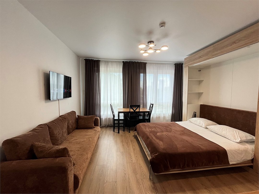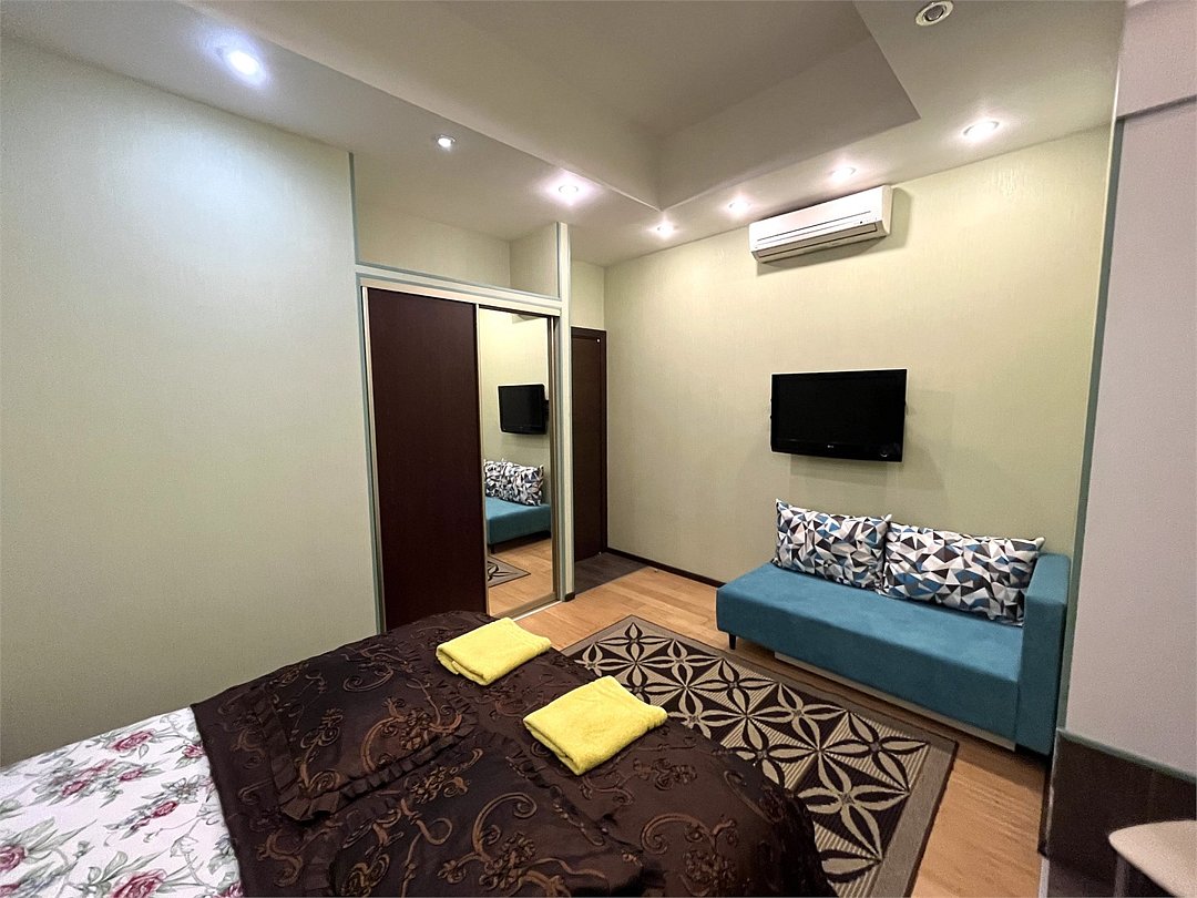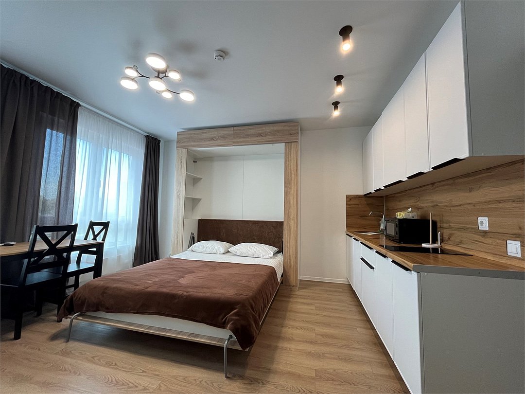 Wi-Fi, кондиционер, светильник, фен, плита для приготовления пищи, микроволновая печь, утюг, водонагреватель, банные полотенца, двуспальная кровать, гладильная доска, стулья, шкаф для одежды, журнальный столик, письменный стол, обеденный стол, зеркало, набор посуды, стиральная машина, чайник, унитаз, раковина, мягкая мебель, отопление, душ, вид на город, кресло, высокие потолки, кухонная посуда, кухонная утварь, столовые приборы, туалетные средства, цифровое тв, диван-кровать, раскладной диван, телевизор с плоским экраном, мини-холодильник, мини-кухня, телевизор со Smart TV, вешалки-плечики, без питомцевВ студии