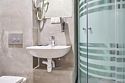 кабельное телевидение, Wi-Fi, кондиционер, светильник, фен, электронные замки, душевая кабина, односпальная кровать, вешалки, унитаз, кулер на этаже, стул, стол, внутренний телефон, телевизор с плоским экраном, мини-холодильникВ номере