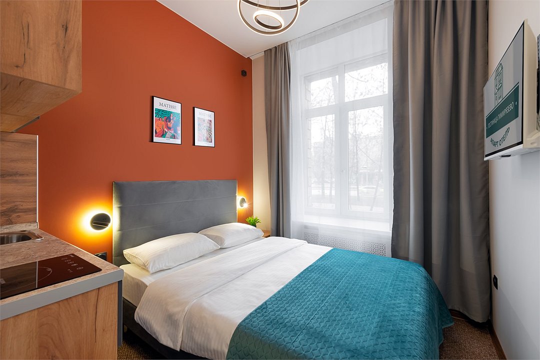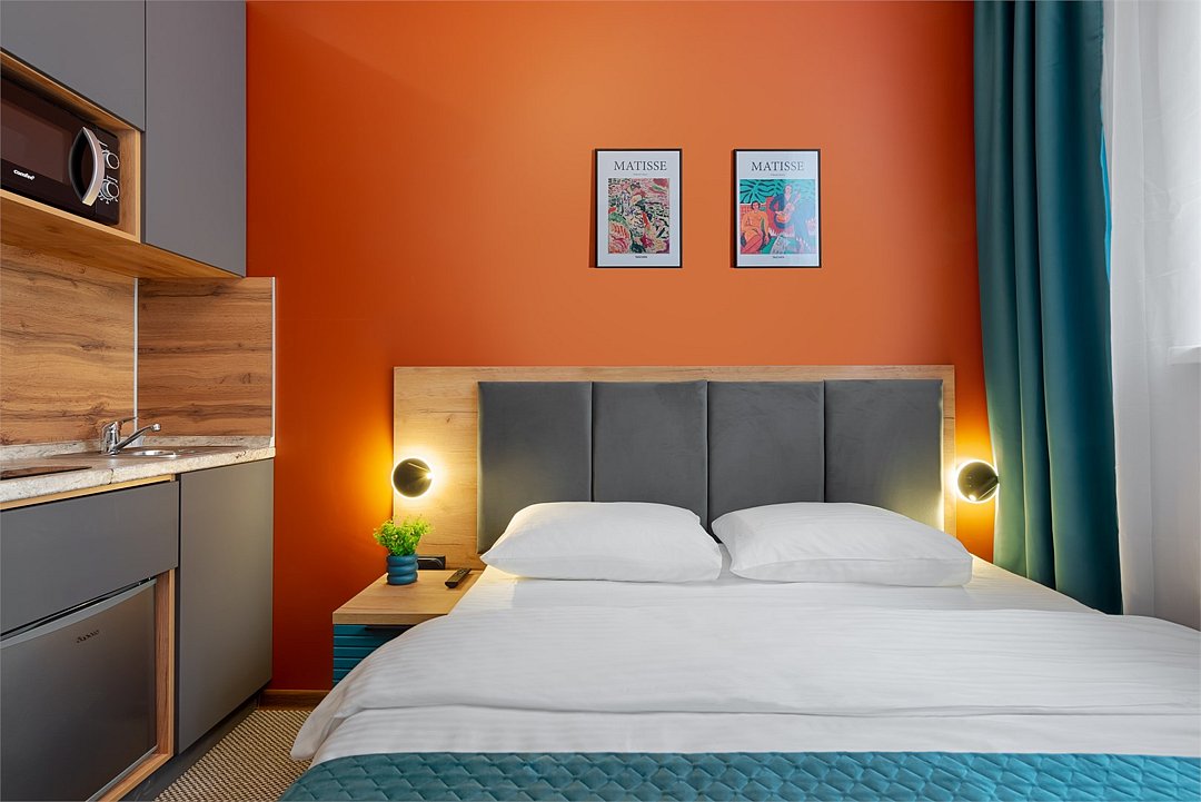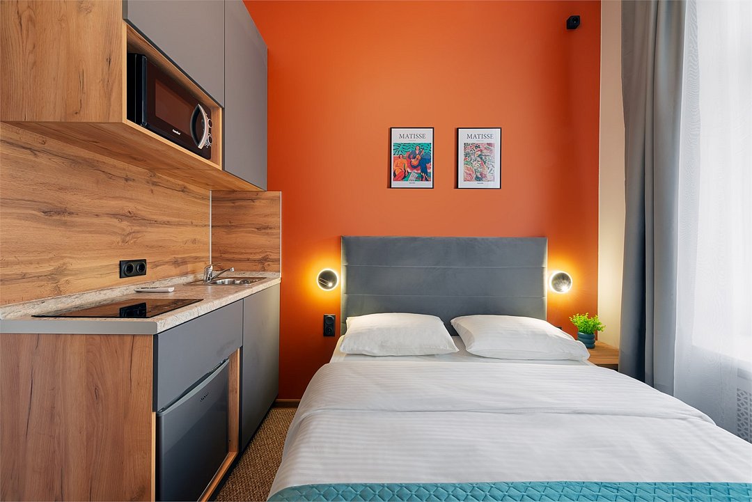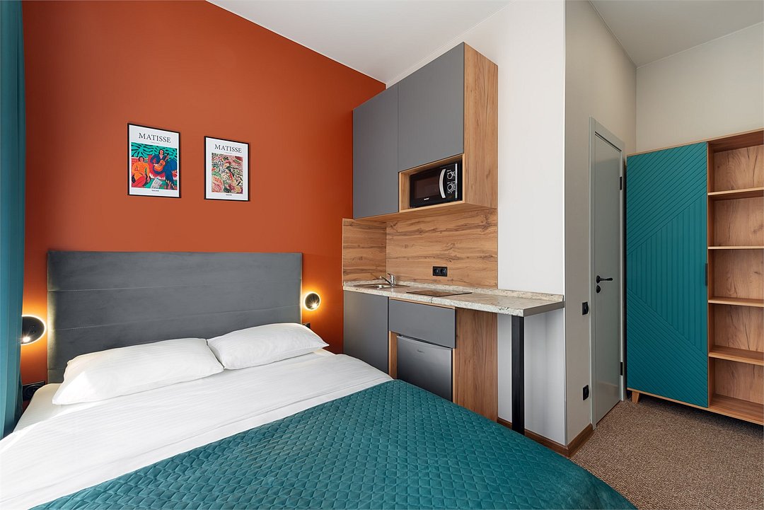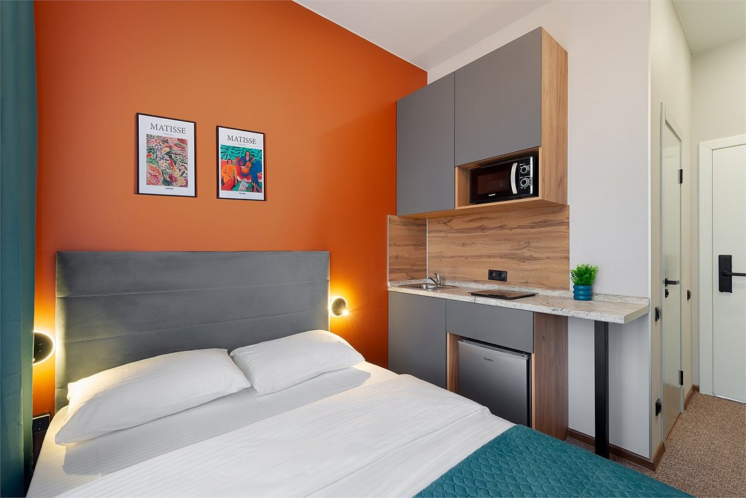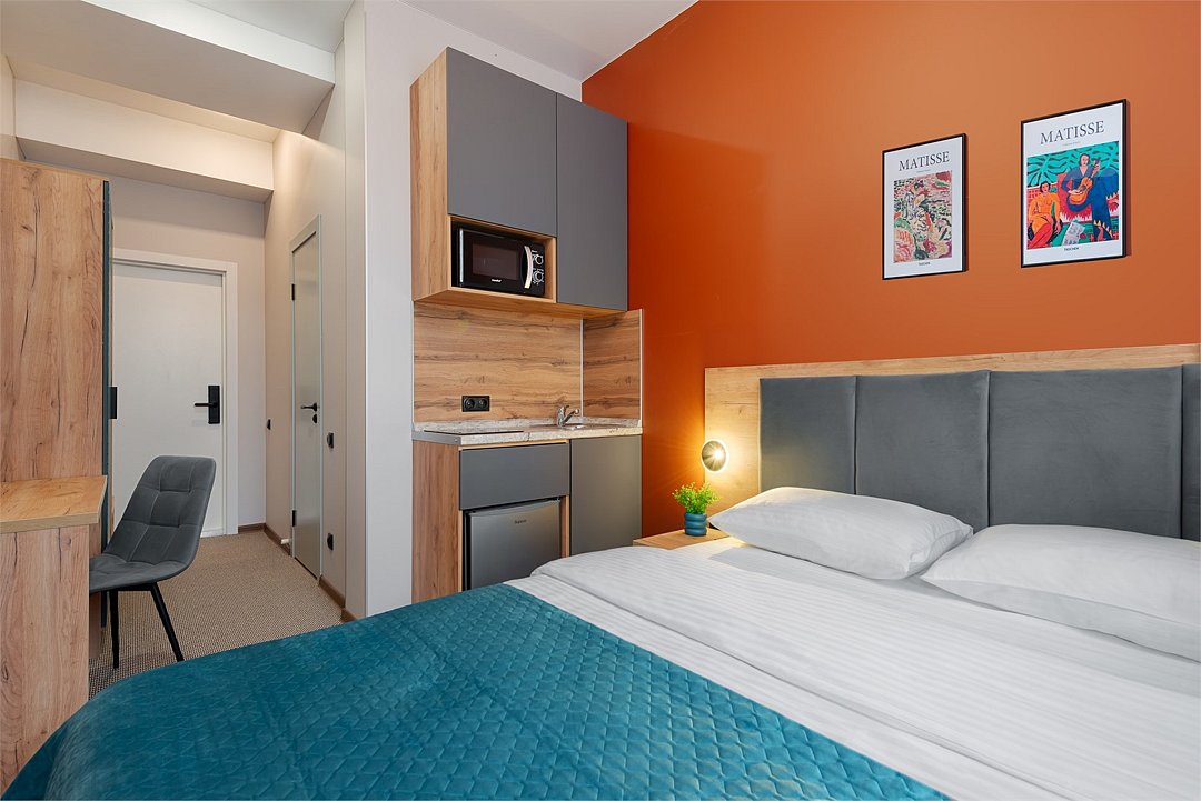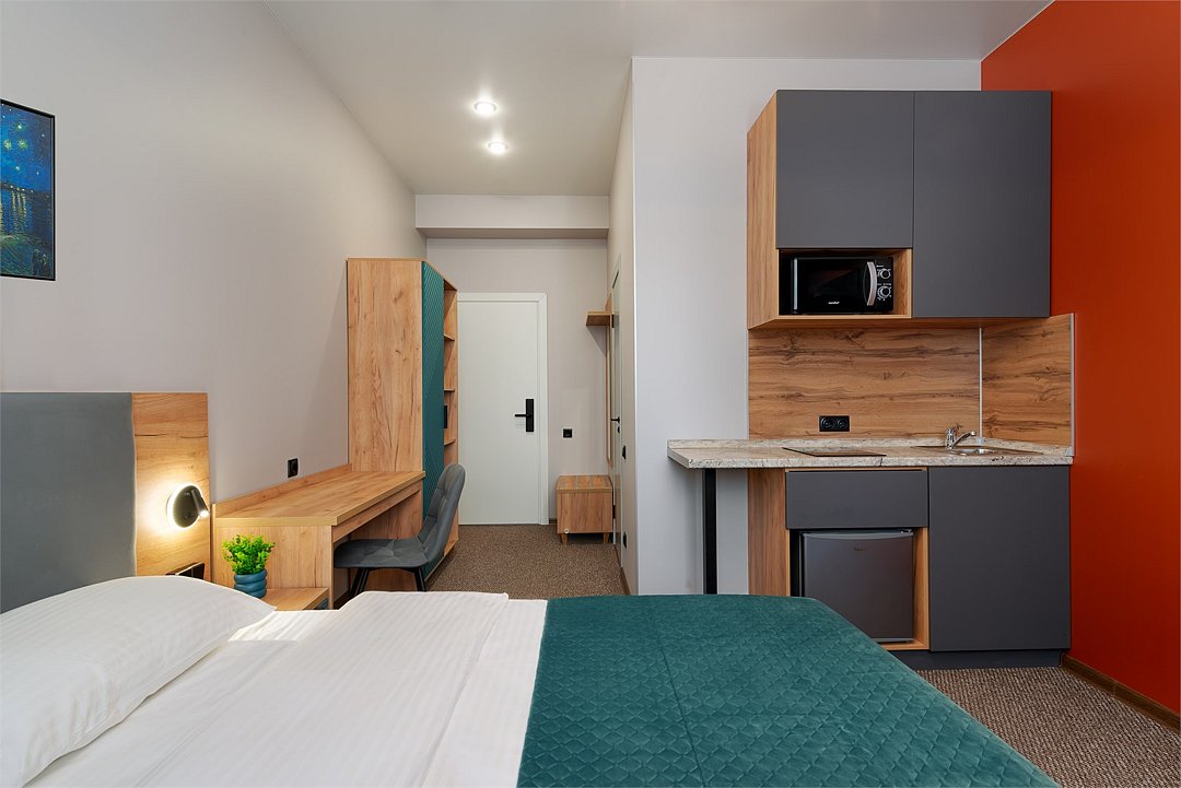 Номер студия с собственной кухней и ванной комнатой. Смарт-тв, электронный замок, микроволновка, холодильник, плита. Подходит для размещения от 1-3 чел.Услуги и удобства