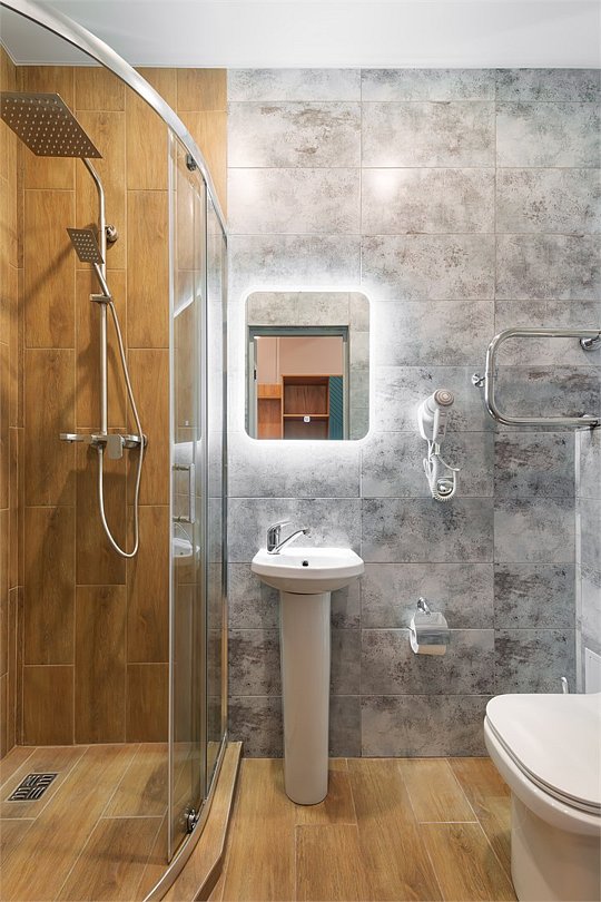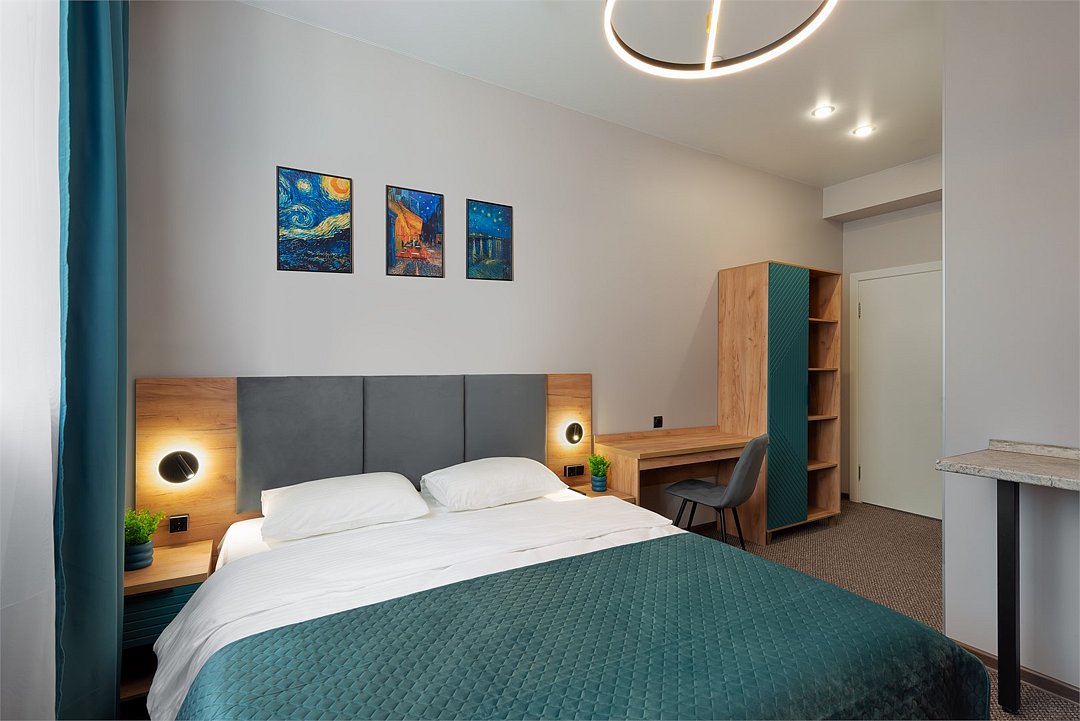 телевизор, спутниковое телевидение, интерактивное телевидение, Wi-Fi, интернет, холодильник, светильник, фен, система безопасности, электронные замки, плита для приготовления пищи, микроволновая печь, утюг, душевая кабина, санузел, банные полотенца, тапочки, две односпальные или большая двуспальная кровать, гладильная доска, ортопедический матрас, вешалки, багажная тумба, зеркало, звуконепроницаемые стены и окна, чайный набор, чайник, унитаз, раковина, ковровое покрытие, отопление, кулер на этаже, вид во двор, высокие потолки, стаканы, столовые приборы, стул, стол, тумба, туалетные средства, туалет, сплит-система, цифровое тв, телевизор с плоским экраном, мини-кухня, телевизор со Smart TV, номер для некурящих, электронный консьерж 24/7, онлайн-регистрация до заезда, уборка номера, вешалки-плечики, самостоятельная регистрацияВ номере