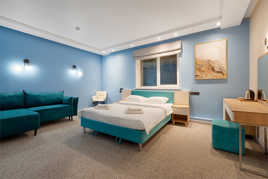 Wi-Fi, фен, тапочки, гигиенические средства, двуспальная кровать, гипоаллергенное белье, ортопедический матрас, вешалки, зеркало, звуконепроницаемые стены и окна, обслуживание номеров, раковина, мягкая мебель, ковровое покрытие, отопление, душ, кулер на этаже, высокие потолки, стол, тумба, туалет, цифровое тв, раскладное кресло, мини-холодильник, телевизор со Smart TV, номер для некурящих, пуфик, кресло-кровать, уборка номера, частный двор, мыло, прачечная (за дополнительную плату)В номере
