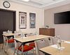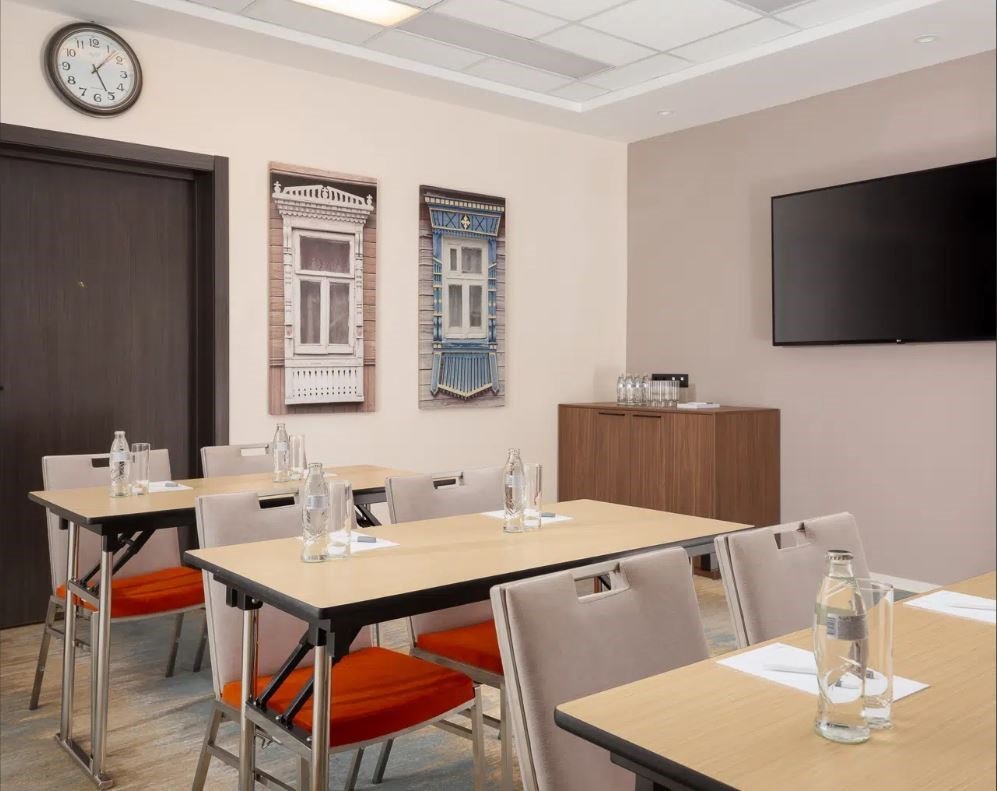 Зал с естественным освещением площадью 28 кв. м, оснащенный двумя большими экранами диагональю 63 дюйма и всем необходимым для проведения деловой встречи или конференции.