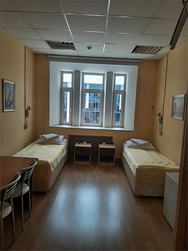 Wi-Fi, светильник, фен, вентилятор, будильник, утюг, банные полотенца, две односпальные кровати, гладильная доска, тумбы, стулья, шкаф для одежды, зеркало, чайник, отопление, вид на город, кулер на этаже, вид во двор, высокие потолки, стаканы, кофейный столик, туалетные средства, санузел на этаже, цифровое тв, внутренний телефон, телевизор с плоским экраном, мини-холодильник, душ на этаже, уборка номераВ гостиничном номере