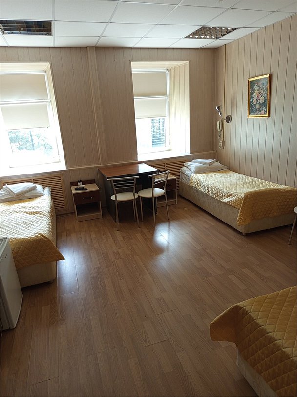 Wi-Fi, светильник, фен, вентилятор, будильник, утюг, банные полотенца, гладильная доска, тумбы, стулья, шкаф для одежды, вешалки, письменный стол, зеркало, чайник, раковина, отопление, вид на город, кулер на этаже, три односпальные кровати, высокие потолки, туалетные средства, санузел на этаже, цифровое тв, внутренний телефон, телевизор с плоским экраном, мини-холодильник, душ на этаже, уборка номераВ гостиничном номере