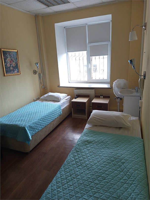 Wi-Fi, светильник, фен, вентилятор, будильник, банные полотенца, две односпальные кровати, гладильная доска, тумбы, стулья, шкаф для одежды, вешалки, письменный стол, чайник, раковина, отопление, вид на город, кулер на этаже, вид во двор, высокие потолки, туалетные средства, санузел на этаже, цифровое тв, внутренний телефон, телевизор с плоским экраном, мини-холодильник, душ на этаже, уборка номераВ гостиничном номере