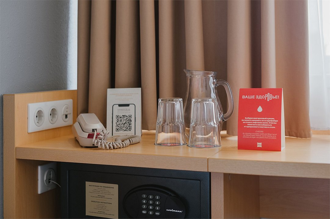 спутниковое телевидение, Wi-Fi, светильник, фен, система безопасности, электронные замки, душевая кабина, санузел, банные полотенца, тапочки, две односпальные кровати, вешалки, багажная тумба, зеркало, звуконепроницаемые стены и окна, мини-бар, сейф, раковина, ковровое покрытие, отопление, кулер на этаже, центральное кондиционирование, вид во двор, стаканы, стул, туалет, внутренний телефон, телевизор с плоским экраном, номер для некурящих, фанкойл, рабочий стол, экологичный подход, уборка номера, услуги прачечной (платно), мыло, затемняющая штора, открытый шкаф, можно с питомцамиВ номере