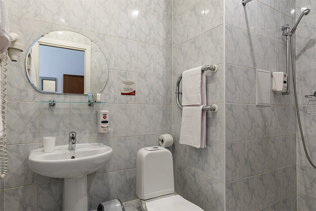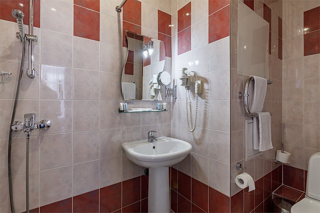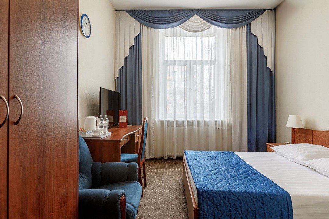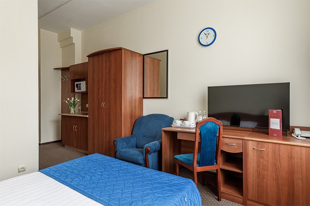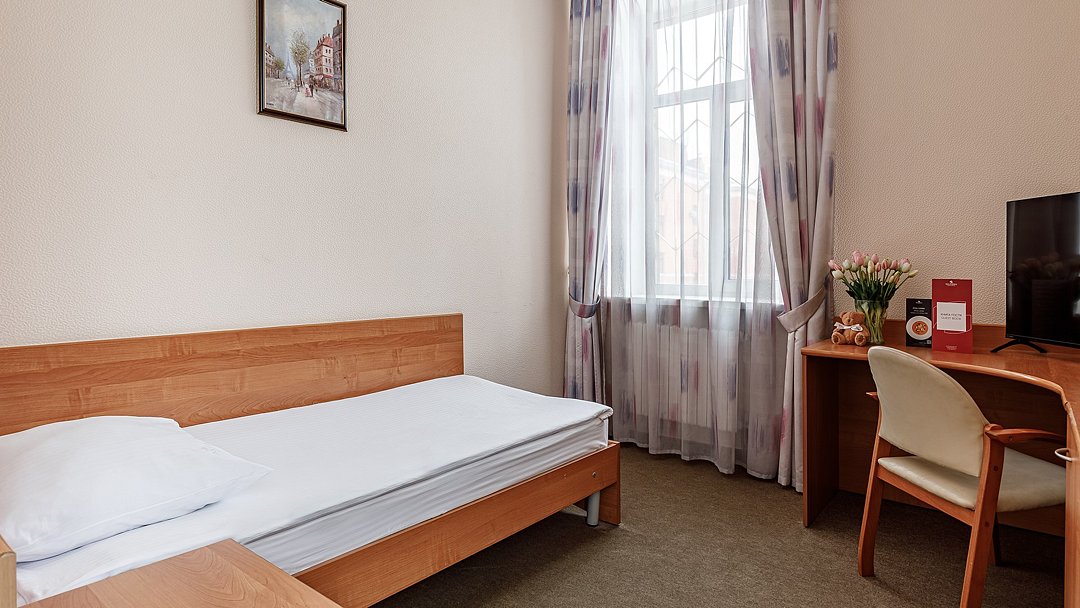 телевизор, спутниковое телевидение, кабельное телевидение, интерактивное телевидение, Wi-Fi, телефон, светильник, настольные лампы, фен, электронные замки, ванная комната, душевая кабина, санузел, гигиенические средства, косметические средства, односпальная кровать, ортопедический матрас, тумбы, стулья, шкаф для одежды, вешалки, письменный стол, багажная тумба, зеркало, письменные принадлежности, обслуживание номеров, информационная карта, меню, унитаз, раковина, вид на город, вид во двор, стаканы, можно с питомцамиВ гостиничном номере