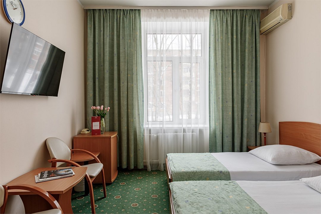 телевизор, спутниковое телевидение, кабельное телевидение, интерактивное телевидение, Wi-Fi, телефон, светильник, настольные лампы, фен, электронные замки, ванная комната, душевая кабина, санузел, гигиенические средства, косметические средства, две односпальные кровати, ортопедический матрас, тумбы, стулья, шкаф для одежды, вешалки, письменный стол, багажная тумба, зеркало, письменные принадлежности, обслуживание номеров, информационная карта, меню, унитаз, раковина, вид на город, вид во двор, стаканы, можно с питомцамиВ гостиничном номере