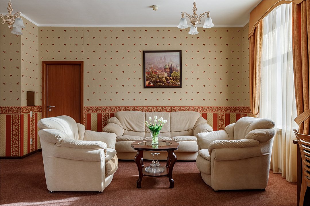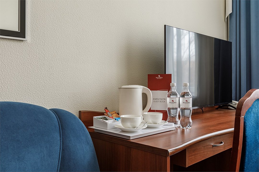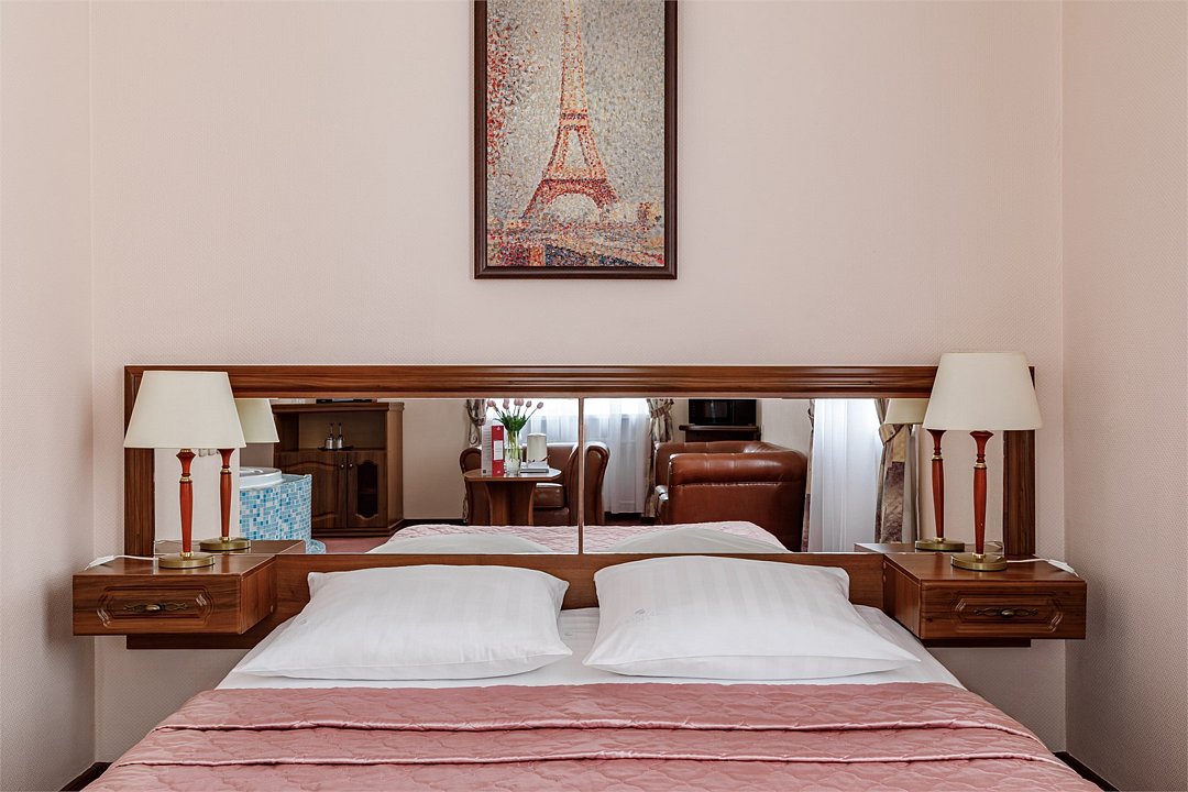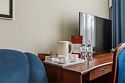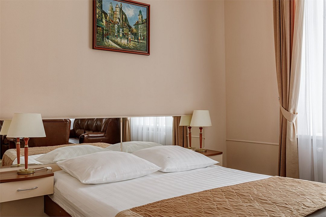 телевизор, спутниковое телевидение, кабельное телевидение, интерактивное телевидение, Wi-Fi, телефон, светильник, настольные лампы, фен, электронные замки, ванная комната, ванна, тапочки, гигиенические средства, косметические средства, двуспальная кровать, ортопедический матрас, диван, кресла, тумбы, стулья, шкаф для одежды, вешалки, журнальный столик, письменный стол, багажная тумба, зеркало, письменные принадлежности, чайный набор, обслуживание номеров, информационная карта, меню, сейф, чайник, унитаз, раковина, мягкая мебель, косметическое зеркало, вид на город, вид во двор, можно с питомцамиВ гостиничном номере