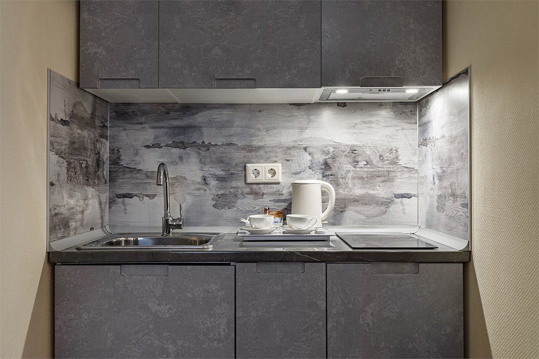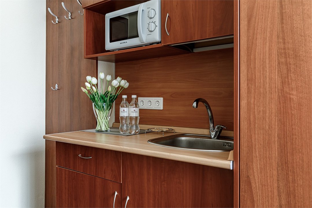 В номере: - Площадь номера от 22 м2. - Двуспальная кровать 140*200 см. - Бесплатный Wi-Fi - Письменный стол или журнальный столик - Телефон - Телевизор - Спутниковое телевидение - Шкаф для верхней одежды - Дополнительное место не предусмотрено - Дети до 10 лет включительно размещаются бесплатно без предоставления дополнительного места Обеденная зона: - Электрический чайник - Чайная пара - Микроволновая печь - Плита индукционная - Мини-холодильник - Столовые приборы и набор посуды В ванной комнате: - Душ или ванна - Фен - Комплект полотенец - Диспенсер с моющим средствомУслуги и удобства