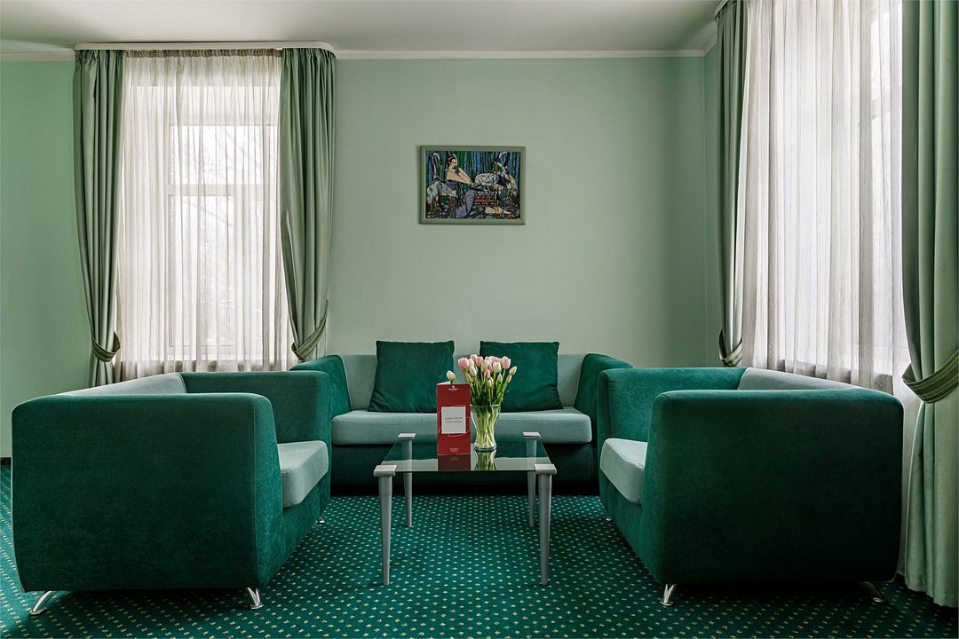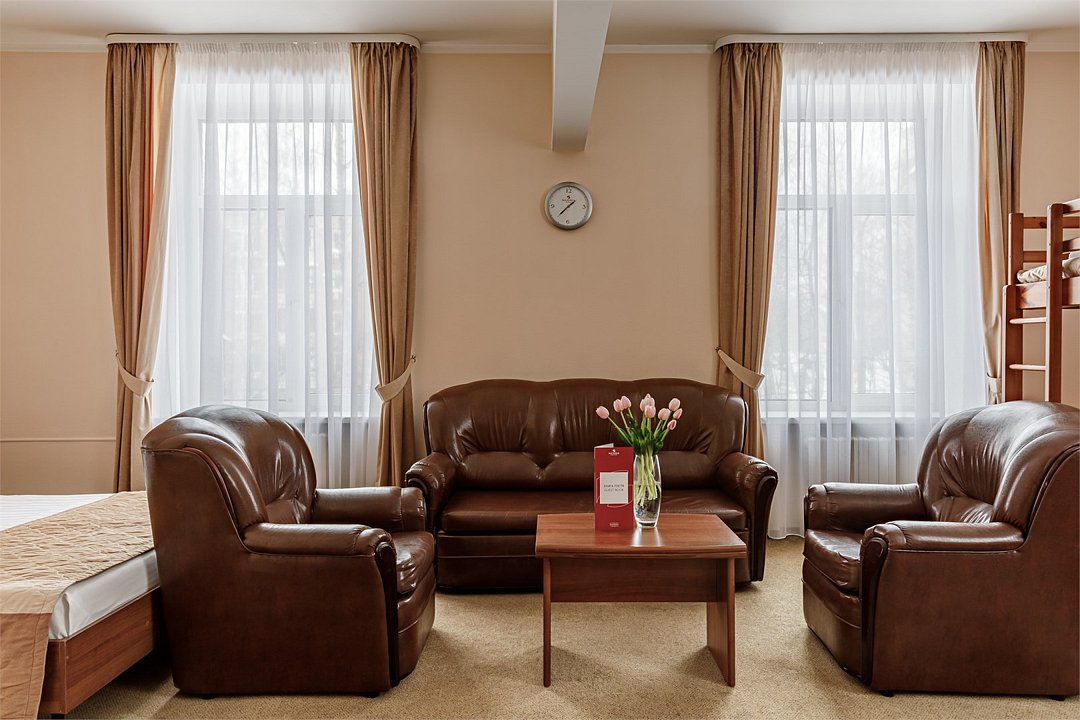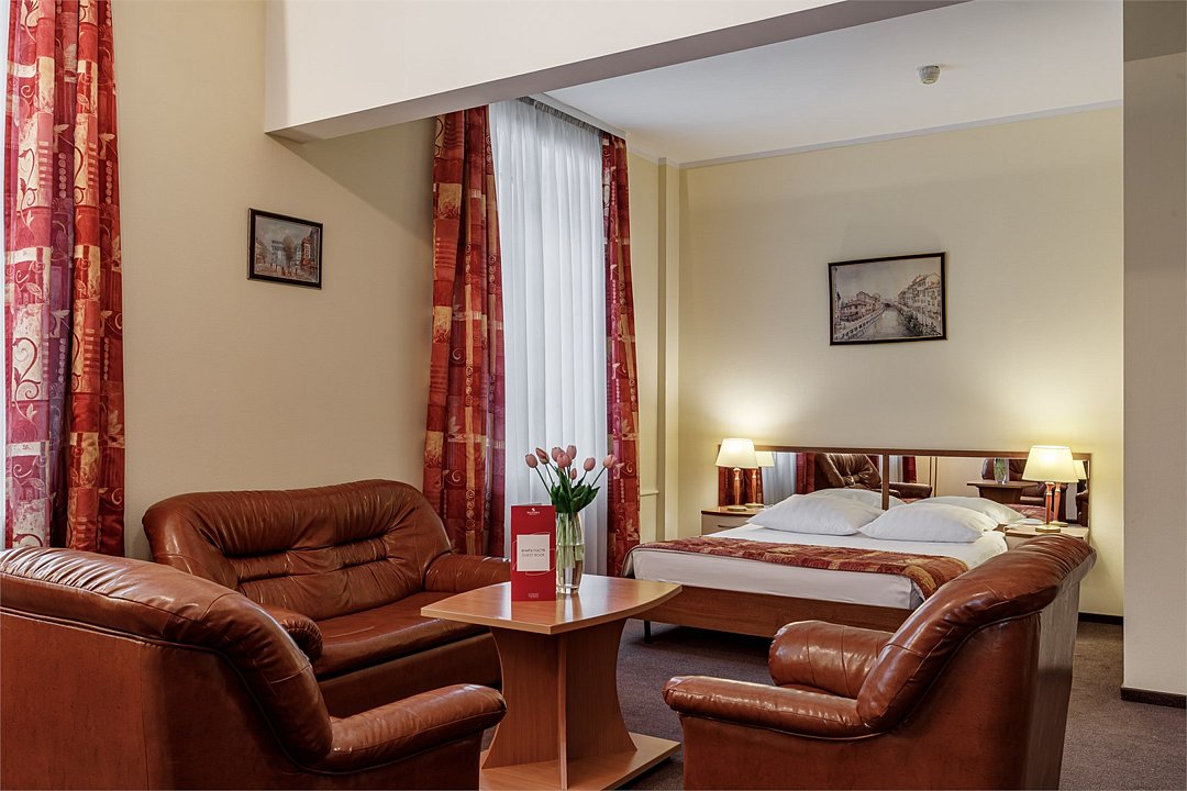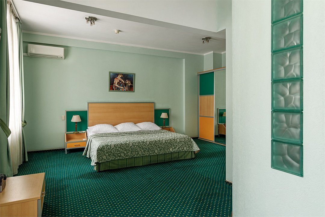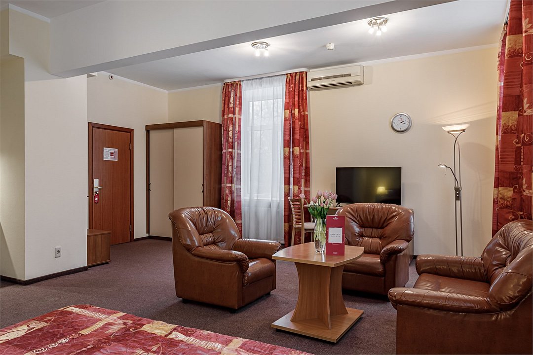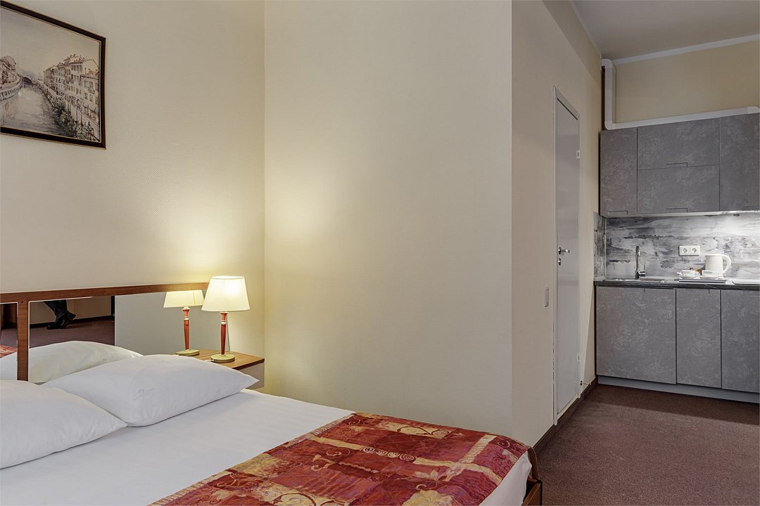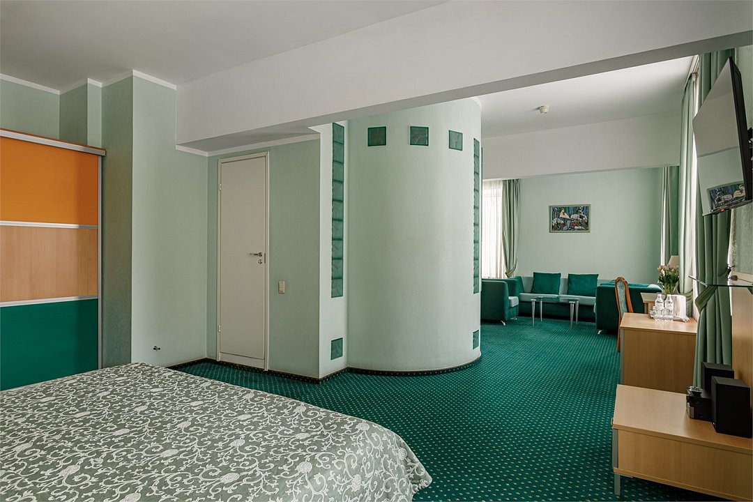 - Площадь номера 34 кв.м. - 2 комнаты: спальня и кухня - Бесплатный Интернет - Центральное кондиционирование с индивидуальным пультом управления - Дополнительное место предоставляется по запросу (стоимость без питания 1500 руб./сутки) - Дети до 10 лет включительно размещаются бесплатно без предоставления дополнительного места В спальне: - Две раздельные кровати (90*200 см) - Мягкий диван и кресло - Телефон - Письменный стол - Журнальный столик - Индивидуальный сейф - ЖК телевизор - Спутниковое телевидение В кухне: - Кухонный гарнитур - Холодильник - Встроенная варочная поверхность - Электрический чайник - Тостер - Набор посуды В ванной комнате: - Ванна или душ - Фен - Тапочки - Комплект полотенец - Косметические принадлежностиУслуги и удобства