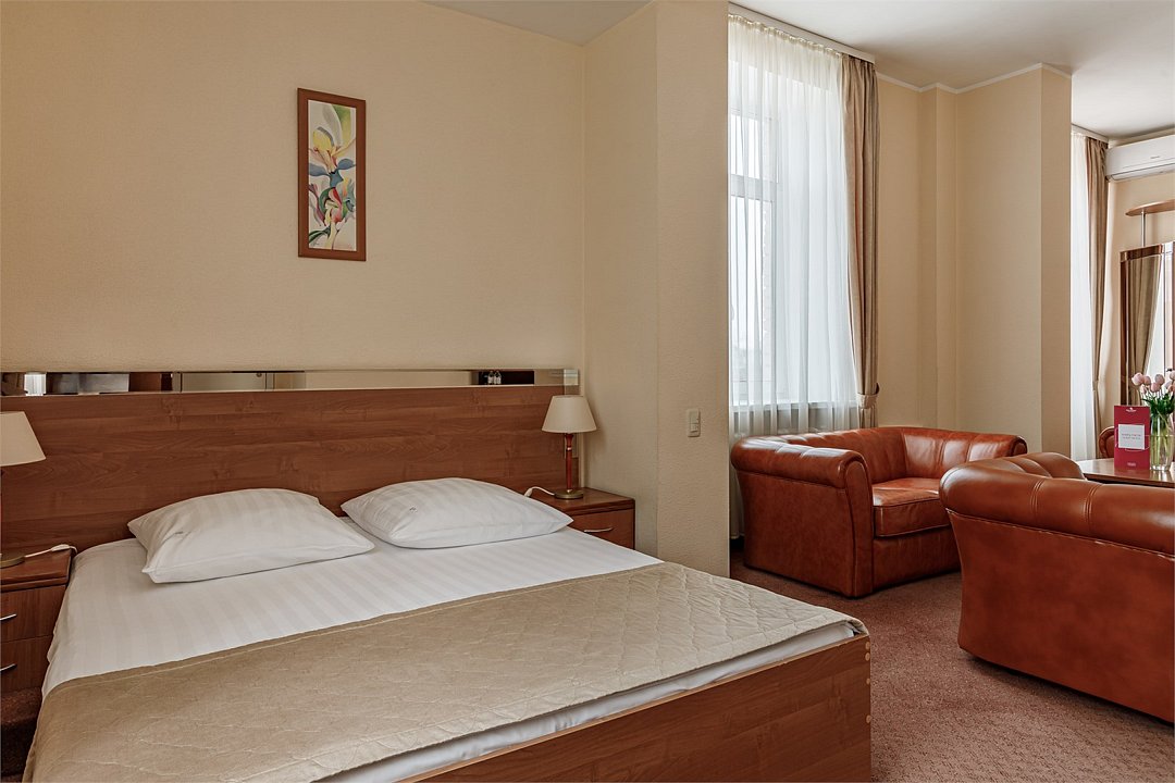 - Площадь номера от 28 кв.м. - Кровать 150*200 см. - Бесплатный Wi-Fi - Индивидуальный сейф - Чайная пара - Чай, кофе, сахар и сливки - Расческа - Кондиционер - Телефон - Гарнитур мягкой мебели - Журнальный столик - ЖК телевизор - Спутниковое телевидение - Шкаф для верхней одежды - Дополнительное место предоставляется по запросу (стоимость без питания 1500 руб./сутки) - Дети до 10 лет включительно размещаются бесплатно без предоставления дополнительного места В ванной комнате: - Ванна - Фен - Тапочки - Комплект полотенец - Косметические принадлежностиУслуги и удобства
