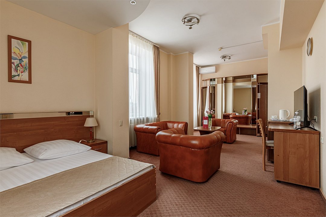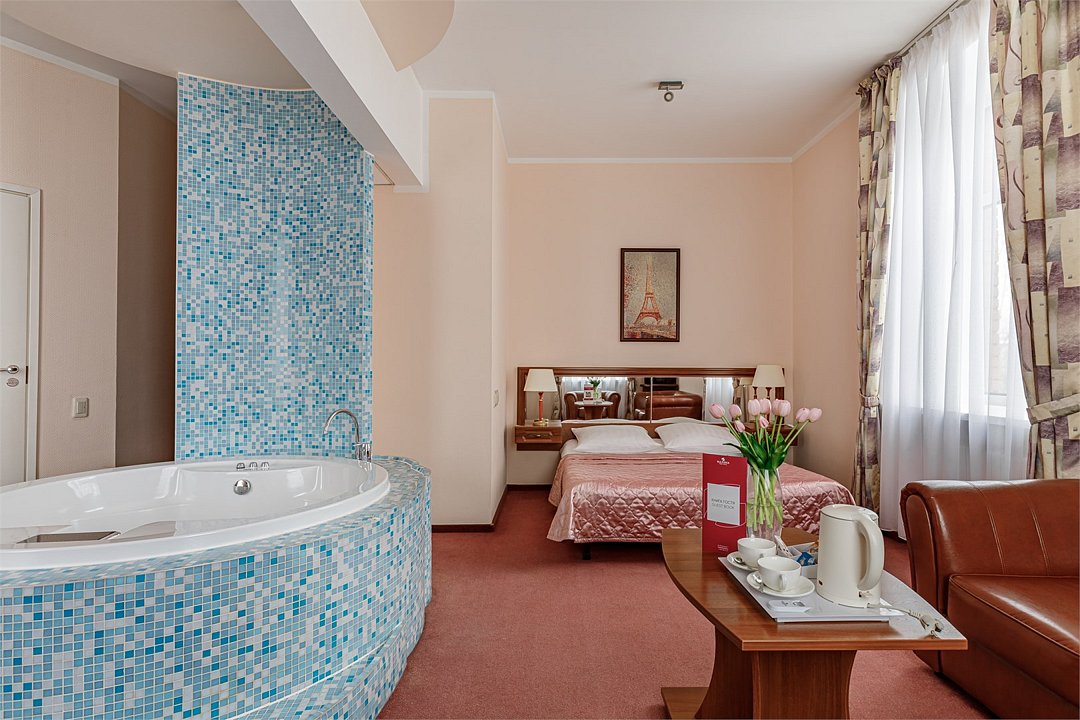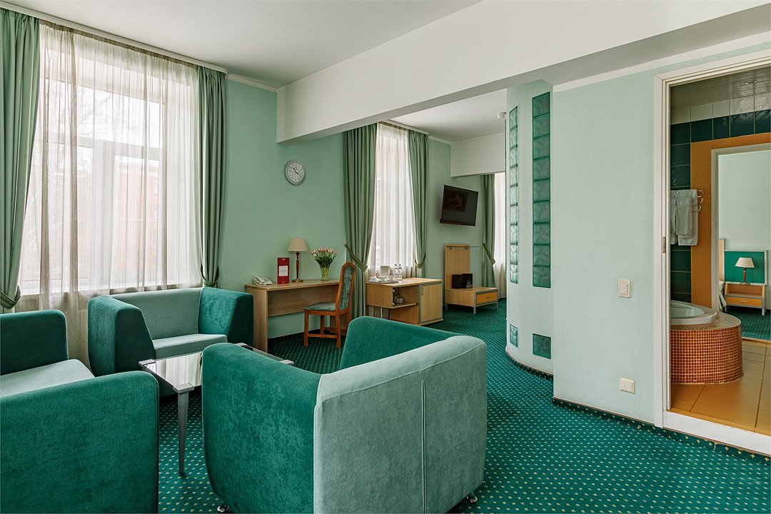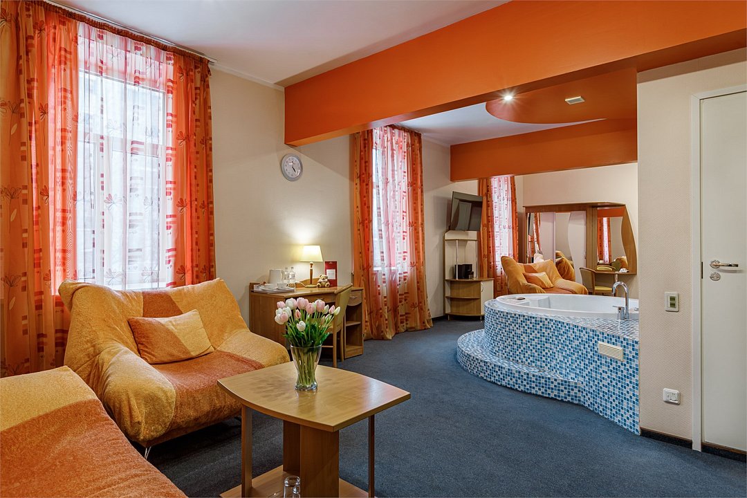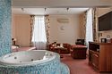 - Площадь номера 58 кв.м - Кровать 160*200 см - Бесплатный Wi-Fi - Индивидуальный сейф - Чайная пара - Чай, кофе, сахар и сливки - Минеральная вода - Расческа - Кондиционер - Джакузи - Гарнитур мягкой мебели - Телефон - Журнальный столик - Письменный стол - Широкоформатный ЖК телевизор - Музыкальный центр - Спутниковое телевидение - Шкаф для верхней одежды - Дополнительное место предоставляется по запросу (стоимость без питания 1500 руб./сутки) -Дети до 10 лет включительно размещаются бесплатно без предоставления дополнительного места В ванной комнате: - Душ - Джакузи - Фен - Два халата - Одноразовый зубной набор - Тапочки махровые - Комплект полотенец - Косметические принадлежностиУслуги и удобства