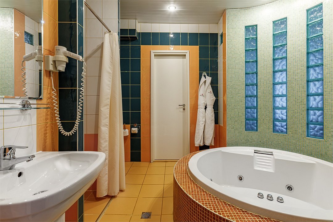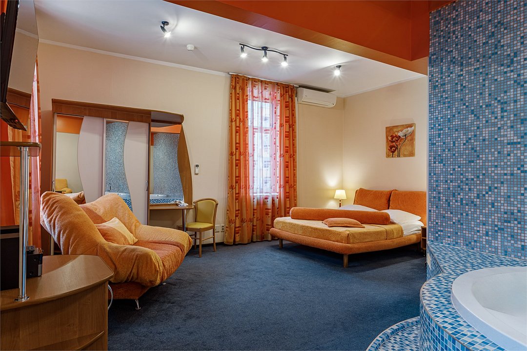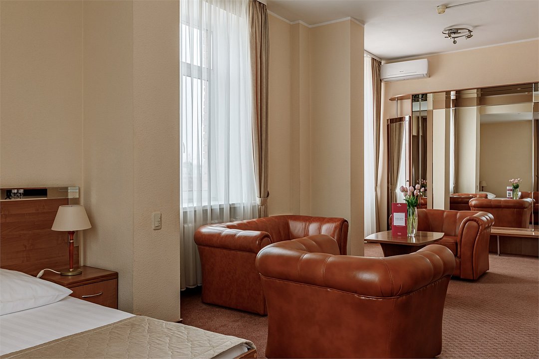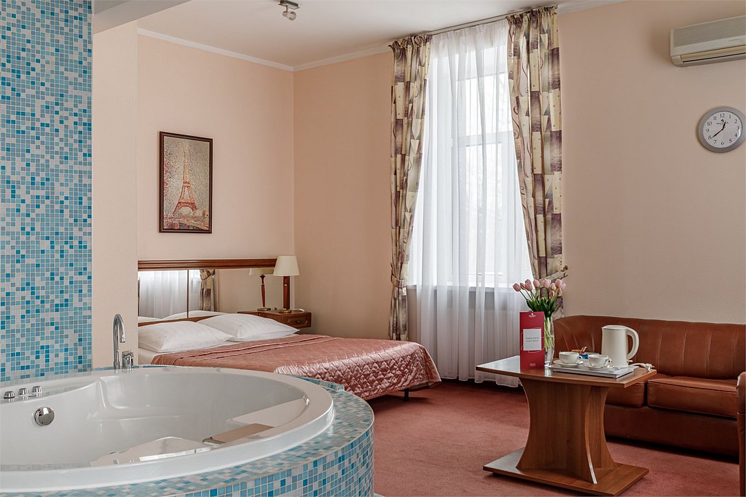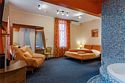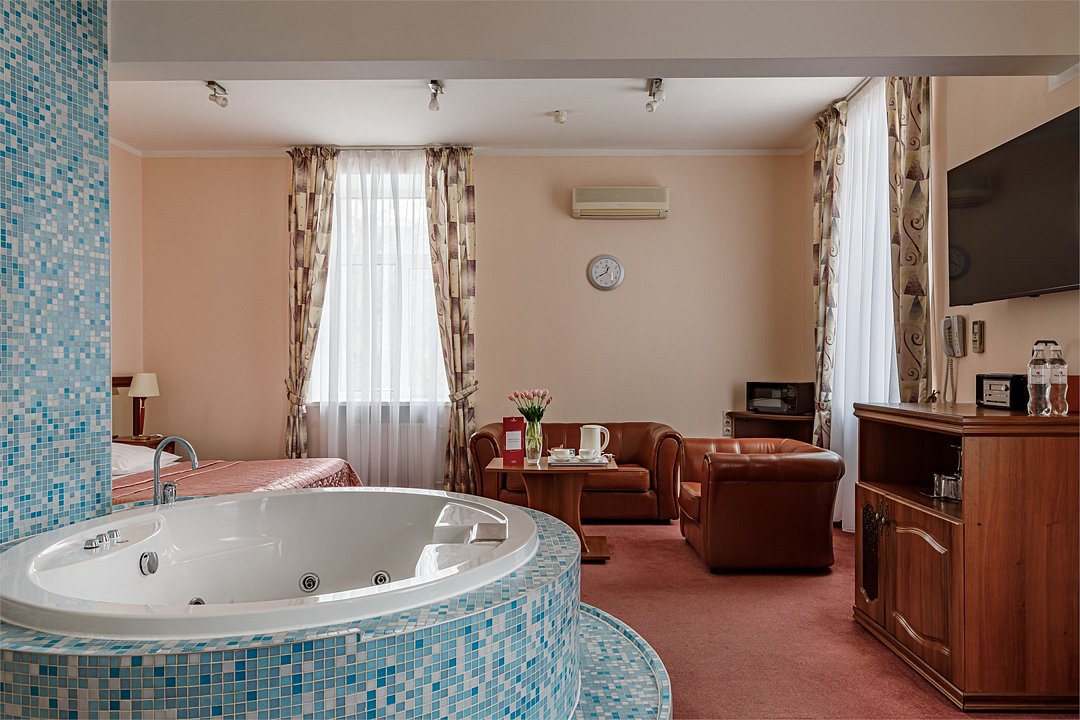 - Площадь номера 58 кв.м - Кровать 160*200 см - Бесплатный Wi-Fi - Индивидуальный сейф - Чайная пара - Чай, кофе, сахар и сливки - Минеральная вода - Расческа - Кондиционер - Джакузи - Гарнитур мягкой мебели - Телефон - Журнальный столик - Письменный стол - Широкоформатный ЖК телевизор - Музыкальный центр - Спутниковое телевидение - Шкаф для верхней одежды - Дополнительное место предоставляется по запросу (стоимость без питания 1500 руб./сутки) -Дети до 10 лет включительно размещаются бесплатно без предоставления дополнительного места В ванной комнате: - Душ - Джакузи - Фен - Два халата - Одноразовый зубной набор - Тапочки махровые - Комплект полотенец - Косметические принадлежностиУслуги и удобства