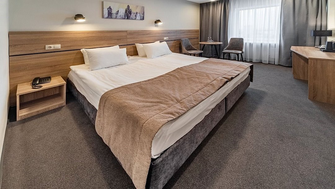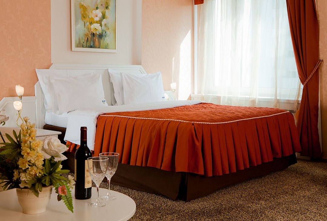 Супериор – современный комфортабельный номер с одной большой кроватью и кондиционером. Комната с двумя креслами и журнальным столиком, удобная ванная комната со всеми необходимыми косметическими принадлежностями, сейф, холодильник, чайная станция, кофейный и чайный набор, тапочки и халат. Питьевая бутилированная вода в номере при заезде. Общая площадь номера составляет 22 кв. м. Период работы кондиционеров: с мая по сентябрь.Услуги и удобства