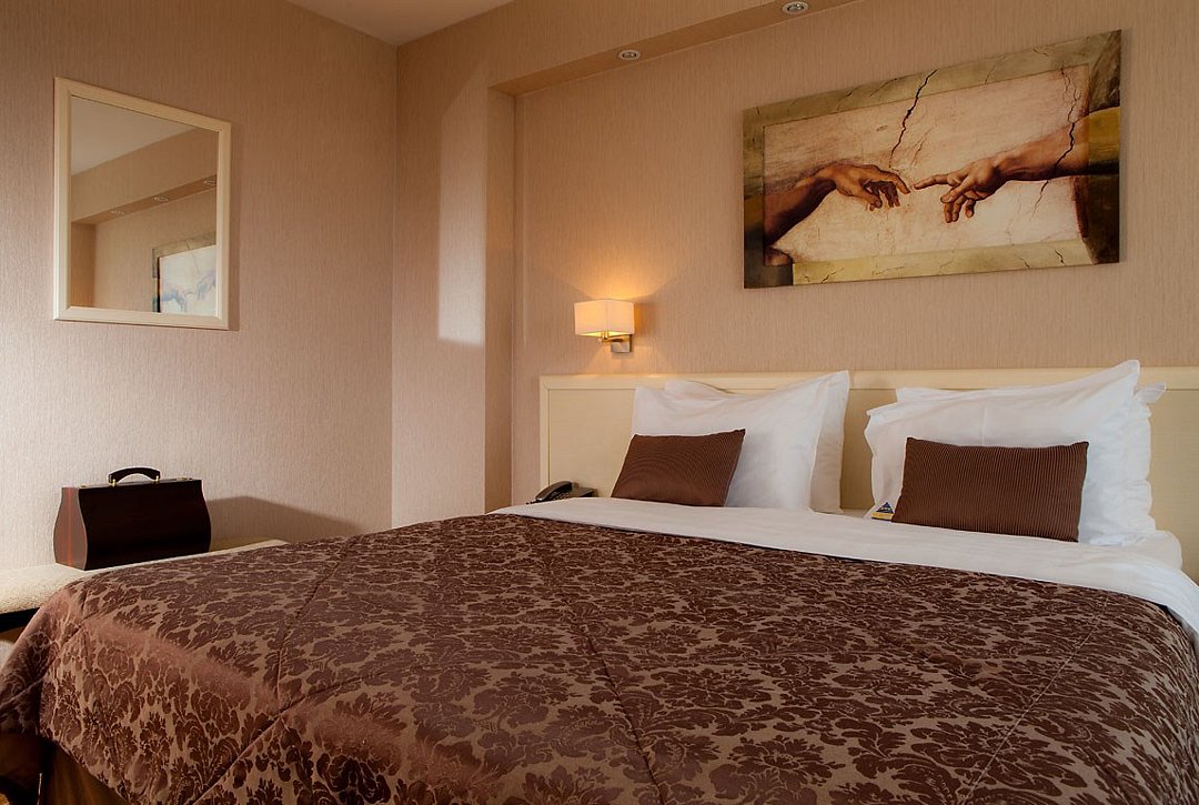 Wi-Fi, телефон, холодильник, светильник, фен, электронные замки, радио, ванная комната, ванна, банные полотенца, гигиенические средства, двуспальная кровать, шкаф для одежды, вешалки, багажная тумба, зеркало, обслуживание номеров, унитаз, раковина, ковровое покрытие, отопление, вид на город, кулер на этаже, кресло, вид на парк, телевизор с плоским экраномВ гостиничном номере